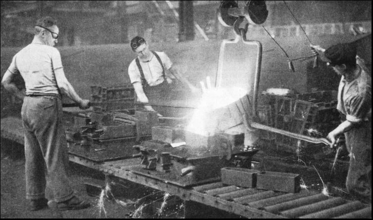 Meanwhile, methods, plant and works were continually being improved to keep pace with the demand. Then it was decided to extend the Cowley plant to assemble up to 150,000 cars a year and to derive full benefit from the system of specialized production in separate supporting factories. The Cowley plant is, therefore, the last link in a chain of operations some of the most important of which are centred in Coventry. At Coventry are the foundry, the engine factory and the plant for turning out coupe and van bodies. The radiator plant is at North Oxford. All the products, not only from these factories but also from the several hundred factories supplying parts and materials, are collected at Cowley to be assembled. Among the main tributaries which feed the mighty stream of production is the foundry, which covers 90,000 square feet at Courthouse Green, Coventry. This new foundry has entirely replaced the original foundry at Cowley. All the stages in the production of cylinder blocks, gear boxes and other castings follow a system of continuous flow. The foundry has been designed to deal with every stage in the production of certain motor car parts. Raw material enters at one end and passes to a machine shop at the other end, emerging as a completely machined unit which is taken to the engine factory in Gosford Street, Coventry. At the cupola end of the foundry raw materials arrive by railway and by road, as railway lines and a private road are parallel. Railway wagons are shunted into the works siding from the L.M.S. line and are handled by a 7-tons petrol locomotive. Coke and limestone, pig iron and sand delivered here are taken across the road by underground conveyers to their respective bunkers within the foundry. A magnetic crane lifts pig iron from the trucks to the storage bins. Sand for moulding is taken from the trucks and delivered to rotary driers, and the dry sand is delivered to the main bunkers by a bucket type conveyer. The range of furnaces consists of two cupolas of 4-feet shell diameter and throe of 5-feet diameter. A feature of the three large cupolas is a door-closing mechanism on ingenious lines designed by Morris Motors engineers. The pigs of iron, before they reach the cupolas, are broken to convenient size by a mechanical breaker. Oil Sand MouldingTHE core sand is drawn from the main bunkers and delivered to local bunkers near the core sand mixers. It is then taken from these in a measuring skip which gives the exact amount required. The core oil is put with the sand and the mixed sand is taken by conveyer to the core makers. When the cores have been prepared they are put on a steel belt conveyer which delivers them to the vertical drying stoves. The speed of the conveyer can be varied according to the type of core, the time taken for the cores to pass through the stoves being from forty-five to ninety minutes. Then they are placed in racks ready for inspection to ensure that they are up to standard. After inspection they are taken to the blacking sprays and they are then re-dried and delivered by a conveyer to the moulding lines. The assembler builds up the mould with accurate gauges in special iron boxes, and with an overhead lifting block places it on a platform conveyer which delivers the mould to the pouring station, where the molten metal is poured in. After this, still on the conveyer, the mould reaches the "knockout" station, where the moulding box is removed and re-delivered to the assemblers. The casting is placed on further platform conveyers, which are timed to deliver the casting to the final "knockout" station cool enough to handle. Here the cores are removed. Then the casting is placed on a roller track, where it is fettled with grinders and pneumatic hammers and delivered to the shot blast cabins. On it passes to the inspectors to be gauged with jigs, and then to the dispatch department for delivery to the machine shops. Before passing into the machine shops, which are adjacent to the foundry, the cylinder block is pickled in an acid bath, which finally clears away any odd particles of sand adhering to the casting. After a final cleansing in water, the castings then proceed to the machine shop, where the main faces are milled on large and powerful milling machines which weigh some 30 tons. After the main faces have been checked for accuracy, the cylinders proceed through their various boring, drilling and tapping operations, some of the machines drilling and tapping as many as seventy holes in one operation. Even with these multiple operations, a cylinder block passes through more than fifty machines before it is complete.