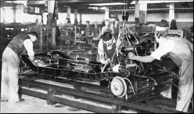 An ingenious electrical machine which checks the amount of moisture in timber resembles a radio receiving set with a pronged device attached. The amount of moisture in the timber is important, because if the wood is too damp it will shrink and warp after it has been fitted to a car, whereas should it be too dry it will lose its nature and strength. Before the wood is passed to the sawmills it is checked. The two prongs of the instrument are pressed into the timber, and if the moisture is not in accordance with standard the fact is indicated by a dial and a glowing light. Less spectacular but also important are the glass jars in which wood preservatives are tested by bacillus cultures. Wood which has been impregnated with preservative is injected with the harmful cultures and placed in a glass jar. If the preservative does what is claimed for it nothing happens. If not, fungus begins to appear and to grow. Another device tests the carpet used on the floor of a car by reproducing the effect of 150 miles of walking on it. Comparison of the weight before and after the test enables the quality of the carpet to be estimated. Safety glass is tested by taking samples and dropping on to the glass a steel ball from a height. Rubber components have to pass a variety of tests. One instrument measures hardness or elasticity, another the breaking strain, and components have also to pass through the weather machine. Metals are tested by various methods and instruments, among which is a microscope that magnifies the structure of steel 4,500 times. A "steeloscope" is used for determining the composition of steels. An electric arc directs light rays from the part under test into this instrument, where they are split up and separated into their various wavelengths. The separated rays are projected on to a viewing screen in the form of bright lines, the position and brightness of which indicate the composition of the steel under test. The operator can thus see the composition of the metal and he is able to confirm the normal lengthy process of analysis. Set of Tyres in 16 SecondsPETROL tanks are fed on to a conveyer, where they are dealt with as they pass through the spray booth and treated with petrol-proof black lacquer. On the axle sub-assembly line the axles are fed into the finished axle store, where the axle for each model of car has its own storage racks. Here the axles wait their turn to be placed on a conveyer which will deliver them to the chassis assembly line. Wings, carriers and other components which need a hard black finish are received near the stove enamelling plant and fed to it by band conveyer. Then they are placed on a conveyer which passes them through a hot decreasing bath, a hot-water washing spray, a drying oven, an enamelling bath, and finally through the high-temperature oven which bakes the enamel as hard as rock. The wheels are dealt with in a similar way by a smaller oven, and wheels and wings are then examined and fed by conveyers to their destinations. The engine units arrive at Cowley complete except for a few accessories, and each is placed on a wheeled trolley in the store. Here the unit waits until a travelling elevator picks it up and delivers it to the engine sub-assembly line on a gantry, where the accessories are fitted before the unit is lifted out by a mechanical hoist and lowered into position on to the chassis in the main assembly line. Tyres are delivered to the tyre store near the wheel enamelling plant and tyre fitters put the tyres on the wheels with a speed which astonishes any motorist who has tried to do this job himself. The work of fitting the five wheels is done normally in one minute. On occasion it has been done in sixteen seconds.
