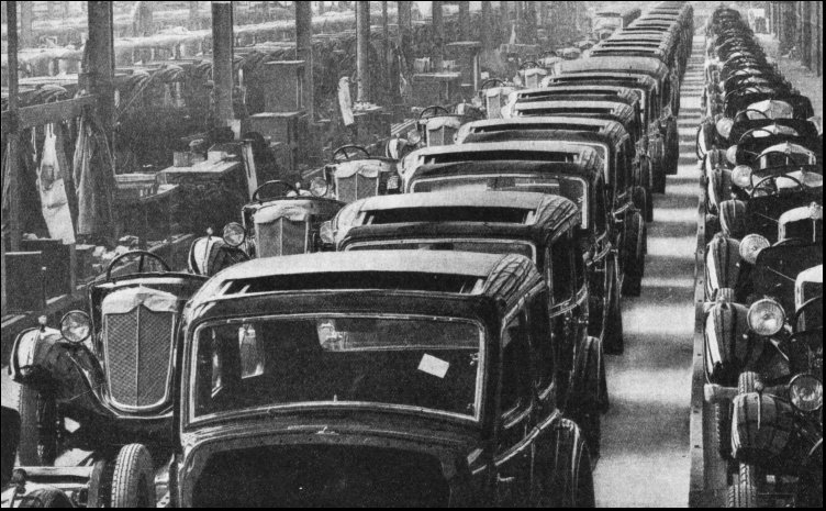 Lord Nuffield, then Mr. W. R. Morris, began his career by supplying and repairing bicycles, the fountain-head of his organization being the Morris cycle works and garage in Long Wall, Oxford. The gownsmen and townsmen of Oxford are great cyclists and in pre-war days the present Lord Nuffield worked with his hands repairing bicycles for undergraduates. He began the experiments which led to the building of the original Morris car and, in 1912, a factory was built at Cowley. Then the war of 1914-18 stopped the making of cars and the factory produced munitions. In 1919 Lord Nuffield had to begin all over again as a car manufacturer, but two years later the world depression of 1921 greatly reduced the demand for cars. This crisis marked the change in Lord Nuffield's career. He was convinced that trade would revive and he set himself to produce a better car at a price within the reach of a wide class of people who would, he foresaw, take up motoring. Sales began to increase rapidly. In a period of ten years production increased from a few hundred to 65,000 cars a year.