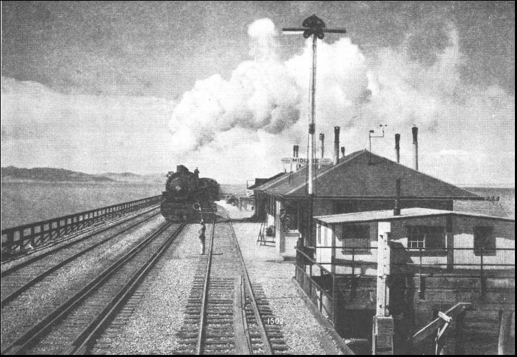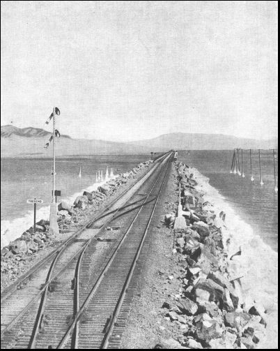 In one place, about a mile from the eastern shore of the lake, a serious difficulty was encountered. The first pile, 28 feet long, was driven out of sight with a single blow. A second pile, also 28 feet long, set on top of the first, disappeared in a similar manner. At some time in the history of this great inland sea there had been here a colossal gulch, which has since been filled up with the slime and mud of the Bear River. For over six months tons and tons of solid rock were poured into this cavity, only to disappear out of sight and touch. The soft mud oozed from under this gigantic weight, allowing it to sink deeper and deeper until the engineers almost lost heart. But perseverance conquered, and the "bottomless pit," as the cavity was rightly named, was duly filled in. For a whole month over 2,500 tons of material a day were tossed into this quagmire. The track was laid from the east and from the west, and the workmen met in the middle of the lake. "Stringers" were brought to them on rafts and lifted to the bridge by means of large cranes. Many thousands of logs for piles were kept in huge booms on the shores of the lake and towed, when needed, to the place where the pile drivers were at work. All told, 38,256 trees, representing two square miles of forest, were cut down to make piles for the great trestle. During the building the men were housed in little encampments on the shores of the lake as near as possible to the bridge itself. All provisions and fresh water had to be brought to the camps daily by train, over distances varying from 80 to 130 miles. In the summer the heat was trying, for the whole region is a vast desert ; in the winter there were sandstorms on land and gales on the lake. The gales proved particularly trying. In one severe storm a number of men had a narrow escape. In the middle of the night some bunk-houses (accommodating twenty-five men), on pontoons moored some distance from the land, were swept away from their moorings and carried down the lake some forty miles. Straight For Over 100 MilesHappily, the occupants were rescued from their perilous position in the nick of time by a towing vessel and were taken safely to land. Gales were so common that material and machinery valued at over £20,000 were lost during the period of construction. For years after the engineers had completed their task the shores of the lake were lined with wreckage bearing testimony to the power of these storms, with the loss of boats, piledrivers and sections of trestle. The great bridge across the lake is a solid path, except for the 600-feet gap on the east and the twelve miles of trestles on the west. The depth of the water here is about 27 feet. The track is carried 19 feet above the surface of the lake. In some places this novel bridge is wide enough to allow for the passing of trains, and on one portion a double track has been laid. In the lengthy crossing there are several stations, Midlake Station being right in the centre of the lake. Passengers alight here to view the vast expanse of water, and trips can be taken by boat to islands in the lake. These islands are the homes of thousands of pelicans, seagulls and other birds. The waters of the lake are too salty to support ordinary fish life. Railings, breast high, have been placed on either side of the permanent way, and refuges have been built for workmen and pedestrians. The cut-off from Lucin to Ogden is dead straight and more nearly level than an ordinary floor. For thirty-six miles there is no grade. Nowhere is the grade over 1 in 240. This novel bridge took two and a half years to build and the cost was £1,600,000.