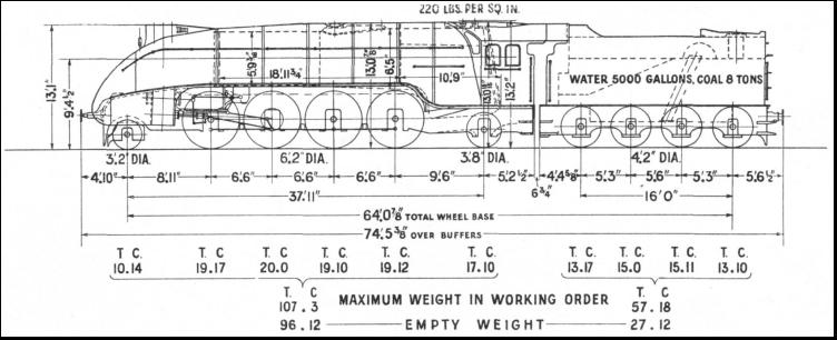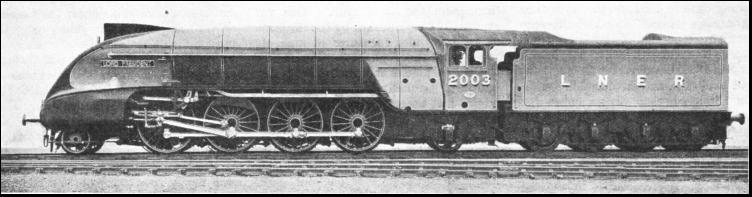 A STREAMLINED version of the exclusive Cock o' the North class of the London and North Eastern Railway, No. 2003 Lord President is one of the few eight-wheels-coupled express passenger locomotives at work in Great Britain. These exceptionally powerful engines are of the Mikado, or 2-8-2 type. They were built to haul trains of 500 tons or more on the heavily graded main line between Edinburgh and Aberdeen, which includes both the Forth and the Tay Bridges. On this route, before the advent of the Mikados, double-heading was common. It is unusual for a modern British express locomotive to have a leading two-wheeled radial truck instead of a leading bogie. Had these locomotives been given bogies, making them 4-8-2s, they would have been unusually long, though not too long for the existing turntables. Other considerations, therefore, influenced the decision to adopt the shorter 2-8-2 wheel arrangement. Built at the Doncastcr Works of the company in 1936, Lord President is generally similar in design to Cock o' the North, which dates from 1934. The most striking difference is that the newer engine is streamlined almost in the same way as the A 4 Pacifics of the L.N.E.R. The engine has three simple cylinders 21 in. diameter by 26-in. stroke, and piston valves, with a maximum valve travel of 5-5/8 in. All three cylinders drive the second coupled axle. The outside cylinders are actuated by Walschaerts valve gear and the inside cylinder by a special form of valve gear devised by Sir Nigel Gresley, designer of the locomotive and Chief Mechanical Engineer of the L.N.E.R. The eight driving wheels are of 6 ft. 2 in., the leading wheels of 3 ft. 2 in. and the trailing wheels of 3 ft. 8 in. diameter. The boiler, with a maximum external diameter of 6 ft. 5 in., has 121 small tubes, of 2-1/4 in. diameter, and 43 superheater tubes, with a diameter of 5-1/4 in. The evaporative heating surface is made up : firebox 237, small tubes 1354.2, flue tubes 1122.8 square feet ; total 2,714 square feet. To this must be added the 776.5 square feet of the superheater, giving a total heating surface of 3490.5 square feet. The grate area is 50 square feet. Two Ross "pop" safety valves are fitted ; the working pressure is 220 lb. per square inch. The tractive effort, at. 85 per cent of the boiler pressure, is 43,462 lb., more than that of any other express passenger locomotive so far built in Great Britain, except others of the same class. The engine weighs 107 tons 3 cwt. and the tender 57 tons 18 cwt. in working order. Total weight of engine and tender is 165 tons 1 cwt. Of the engine weight no less than 78 tons 19 cwt. are available for adhesion.