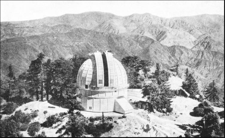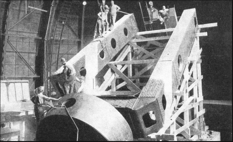 Over 600 tons of steel and 200 tons of cement were carried up in all, and with this material a suitable home for the new telescope was built. Working here on the bleak mountain top in mid-winter was trying and even dangerous, because of the sudden storms. Snowstorms were frequent and, in the cramped space available, care had to be taken not to miss a foothold, which meant being precipitated down the mountainside. One of the carpenters engaged thus had a narrow escape. The timber piling was buried in snow, and while the carpenter was searching for a piece of wood, he started a snow-slide. Before he realized what had happened, he found himself half-buried in snow 600 feet below the summit. He was stopped in his downward flight by striking a tree. He was uninjured. The mounting of the telescope has required the building of an enormous dome, 100 feet in diameter and 100 feet high, beyond which the shutter and fin project 4 feet Up to a height of 28 feet the dome is stationary ; all above this level rotates. The dome is of metal, double-walled throughout to preserve a more uniform temperature through the day. Forty massive piers, arranged in two concentric rings round the main pier on which the telescope is mounted, provide substantial footings, heavy enough to stand severe winter winds. The main pier which carries the telescope is of hollow reinforced concrete and rises to a height of 33 feet, to remove the telescope from ground radiations at night. A solid wall extends to the south of the pier. On the side of this wall is hung the Coude spectrograph, with a focal length of 30 feet. The pier and wall are placed on a bed of sand 6-1/2 feet deep, to prevent any vibrations of the dome from being felt at the telescope. No part of the dome is allowed to touch cither the pier or the wall. Rotating 96-Tons WeightAT the top of the pier is a circular floor 52 feet in diameter. This carries on its outer rim a metal wall rising 9 feet to the upper floor of the dome, and designed to shut off air currents between the top and bottom of the dome. Within the pier there is a system of tanks and pumps arranged to maintain a constant temperature system for the mirror, and here are located the dark room, silvering room and the like. The mounting of the telescope is of the English type, in which the polar axis is in the form of a yoke supported on pedestals at either end, with the tube swinging in the yoke. The pedestals are made of cast iron, that at the north consisting of five sections. The yoke is a massive structure built up of four sections, each weighing about 10 tons. The smaller parts of the telescope were made in the observatory's own workshops at Pasadena, but the heavy castings and large sections of the tube were specially forged in the steel works of a shipbuilding company. Before the yoke was transported to the observatory it was assembled, and the seats for the trunnions and bearings for the declination axis were carefully bored in line and at right angles to each other. It was necessary to fit the various sections together with mathematical accuracy ; the least miscalculation, even to the smallest fraction of an inch, would have spelt ruin. Work of this kind must not be hurried, and has to be checked constantly with delicate scientific instruments.