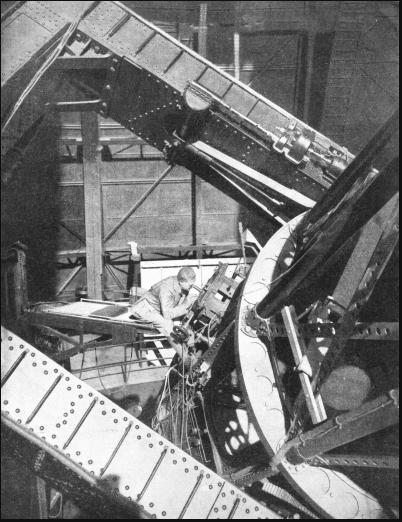 The moving parts of the telescope weigh 96 tons. To permit this enormous mass to be rotated without undue friction the bulk of the weight is taken up by a flotation system. Forty tons of the weight is taken at the north pedestal and 56 tons at the south pedestal. The displacements are obtained by floating steel cylinders built up in cast-iron tanks with less than 1/8-in. clearance between them. This is filled with mercury in which the cylinders float. The tanks had to be carefully machined to keep the volume of mercury small and to ensure freedom of contact with the float. As the different cages and attachments of the telescope have weights differing by several tons, a plunger device is installed to adjust the mercury to any desired level. Mounted at the lower end of the polar axis is a worm wheel which meshes with the driving train of the clock. This wheel has 1,440 teeth accurately cut to avoid periodic error. After assembly in final position on the telescope the graduations of an accurately divided circle were transferred to a brass strip in the rim and checked to one thousandth part of an inch. The teeth on this worm were then cut while the wheel was in position to ensure accuracy. The clock is driven by a massive weight which tips the scale at 1-1/2 tons, the speed being regulated by a governor of the pendulum type. The weight is wound up automatically at intervals of twelve minutes. The rewinding is done without affecting the driving of the clock. The clock stands 6 feet high and occupies a floor space 5-1/2 by 4 feet. It connects with the driving worm by a double universal joint. The tube, which is mounted within the yoke, is 11 feet in diameter and 34 ft. 11 in. long. On this are added cages measuring from 5 ft. 5 in. to 10 ft. 3 in. All sections of the tube were placed in the boring mill and machined true to size, so that upon assembly the tube as a whole would be strained uniformly. The mounting of the mirror required the greatest accuracy. It lies in the bottom of the great tube in a specially designed steel cell. The diameter of the mirror is 101 in. It is 12-3/4 in. thick at the edge and its weight is about 4-1/2 tons. Four years were spent in grinding and polishing it and boring the hole in the centre. What was originally a flat disk of glass was ground until it became parabolic in contour. Any light reflected from any point of its surface comes to a focus at the same point, 42 feet away. Altogether a ton of glass was removed in the grinding and polishing operations. Then followed a coating of silver, deposited by chemical means, when the mirror was ready for insertion in its cell. Mirrors of this size are sensitive to changes of heat and cold, and therefore an elaborate 1-in. cork-board chamber is built round the glass, which, with other apparatus, including pipes and coils and fans, keeps the temperature as desired. Mirrors also become tarnished and have to be re-silvered. Resilvering a 4-1/2 tons giant glass is no light job, but it is done at Mount Wilson twice a year. The mirror is first unfastened in the tube and lowered through the floor in a plunger, or lift, which rises to receive it. Here the resilvering process begins. The old coat of silver is first removed with acid and the glass given a thorough scrubbing. The silvering solution is then poured on. Three pounds of silver nitrate solution are necessary for the job. The surface of the glass is next dried. Then a huge pad worked by a power crank burnishes the film with circular strokes, the disk meanwhile slowly rotating. The silvering of the mirror occupies a dozen men a whole day, preparations beginning as early as 4 o'clock in the morning. The silver film deposited over the glass is about one hundred-thousandth of an inch in thickness. 250,000 Times as BrightTHE instrument is of the reflector type, and it is the reflection of a star which the observer sees. The star's light rays are caught by the large mirror at the bottom end of the telescope tube and reflected back upon a secondary mirror or prism, and there held until examined or photographed. It makes a star appear 250,000 times as bright as the eye sees it. This is because a mirror with a diameter of 100 in. has an area 250,000 times as large as the pupil of the human eye. Only a negligible amount of light is lost in the process of reflection. The use of the mirror brings our nearest neighbour in space, the moon, which is about 240,000 miles away, within a few hundred miles of the earth. It has brought within photographic range 1,500,000,000 stars, whereas fewer than 5,000 can be seen by the naked eye. There are four ways in which observations can be made through the telescope. The four methods are known as the prime, the Newtonian, the Cassegrain, and the Coude focuses.