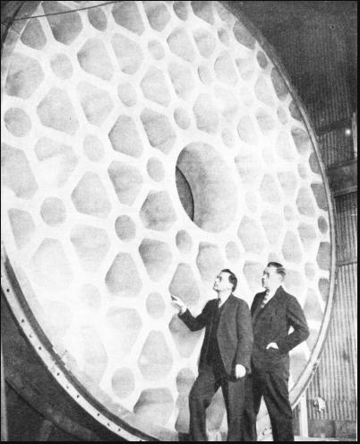 When photographing celestial objects or when obtaining spectra of faint objects, the photographic plate or small spectrograph may be placed at the upper end of the tube, 36 feet above the mirror. This is called the prime focus. In the Newtonian focus a plane mirror is set about 6 feet down the tube and inclined at an angle of 45 degrees. This catches the ray of light reflected from the mirror, bends it at right angles and throws it upon the plate or spectrograph set at the side of the tube. The Cassegrain form involves inserting a convex mirror a few feet below the prime focus. This throws or reflects the light received from the great, mirror to the top of the tube and back again, but in such a way as to pass through the central hole in the big mirror to a focus at the side of the tube near its base where the light can be observed, photographed or analysed by the spectrograph. By making the rays travel up and down the tube in this way the focal length is considerably increased, from 42 feet with the prime and Newtonian methods, to 134 feet with the Cassegrain. With the latter method images are secured of exactly the same size as would be obtainable with a refracting instrument having a tube as much as 134 feet long. In the Coude method the focal length is 250 feet, due to the fact that the beam has to pass down the hollow polar axis of the telescope to a room in the pier where the spectrograph is situated. The telescope and dome are controlled and operated from a deck on the pier at the 42-feet level just south-west of the telescope. To this deck all circuits and circle readings are carried, as well as to the siderial clock and setting circle. Auxiliary controls are also placed at the various foci or observation points of the instrument. All motions are controlled by buttons in the hands of the observer, no matter from what points he may be making observations. Altogether there are used in the dome and on the telescope forty motors of one-twentieth to 7-1/2 horse-power in size, with an aggregate of 50 horse-power and more than thirteen miles of wiring. Disk of 200-in. DiameterWHEN this telescope was built it was thought, the limit had been reached, at least for many years to come. Glass manufacturers declared it was impossible to cast mirrors of larger size. Then someone thought of the possibility of using a special material manufactured by melting boro-silicate glass at an extremely high temperature. Experiments showed that. mirrors of this material were suitable for telescopic work, and a disk 200 in. in diameter has been cast. Casting such a huge slab of glass presented many problems. After the molten glass had been poured into its mould it was allowed ten months to cool to avoid strains and other blemishes. The mirror was not cast in a solid piece as it would have weighed more than 40 tons. This weight was reduced by more than half without loss of structural strength by casting the disk with a ribbed back. The mirror is about 27 in. thick, with a hole of 40-in. diameter in the centre, and weighs about 17 tons. A special machine, weighing over 50 tons, had to be built in which the grinding and polishing operations could be carried out. It is not expected that the great mirror will be ready for work before 1940. It will then be placed in the bottom of a telescope to be built and set up on Mount Palomer, in Southern California. The giant telescope with its tube, mirror and mountings will weigh 450 tons. Mount Palomer was selected as a site for the new telescope after five years' study of the heavens in this region. The sky between the stars is darker here than at any other point, in south-west America. The telescope will undertake no work available to the 100-in. instrument at Mount Wilson, but will be confined to studies of selected celestial bodies. Astronomers declare that it will be powerful enough to penetrate more than three times as far into space as any existing telescope, and to open up an unexplored sphere of the heaven thirty times the volume of that known.