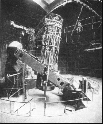 The telescope tube is built in three sections and is sufficiently large for an ordinary motor car to pass through it. To its upper end is attached a skeleton extension measuring over 23 feet long, 7-1/2 feet in diameter and weighing, with all attachments, about 2 tons. Despite the heavy weights of the integral parts—the total weight of the moving parts is about 45 tons—a pull of only 5 lb. upon the upper end of the tube is sufficient to set the instrument in motion. The mirror, the most vital part of the whole instrument, was made from a special high-grade optical glass, in which Belgian manufacturers excel. Many months were spent in grinding and polishing the glass and boring the necessary hole in the centre. The surface was given a thin skin of silver, deposited by chemical means. When finally finished and ready for mounting, the mirror measured 73 in. across its face and was 12 in. thick at the edge, with a hole in its centre 10-1/2 in. diameter. The mirror weighed 4,340 lb., or nearly two tons. Canada was not long to hold the record for owning the largest telescope. The 60-in. reflector at Mount Wilson was doing splendid work, and the fact that the object glass of the Canadian instruments had been successfully increased another 12 in. led American astronomers to contemplate building an instrument with a mirror of 100 in. diameter.