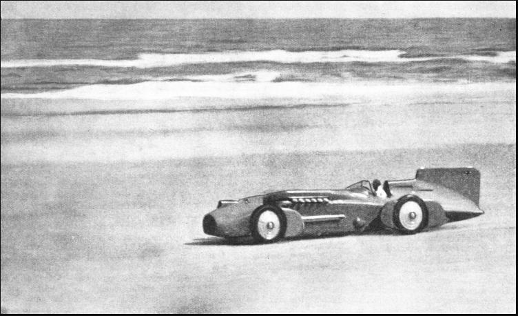 Again Blue Bird was sent out to Daytona, arriving in February 1935, and again Campbell was faced with unsuitable conditions. On some days the tide and wind were favourable, but the surface was in bad condition ; on days when the surface was better, tide or wind would be unfavourable. On March 7, 1935, Campbell took out Blue Bird and reached a new figure—276.816 miles an hour—thus beating his previous best by a small margin. He wrenched his wrist rather severely while changing gear, and this proved a handicap in controlling the car during the run and in correcting the skids, which were becoming inevitably associated with Daytona's surface. Soon after this attempt, however, came the discovery of a new spot for record breaking—the Bonneville Salt Flats, near Salt Lake City, Utah. Here was a surface which would provide greater adhesion than had ever been possible during recent years at Daytona. The designer, driver and mechanics knew perfectly well that Blue Bird was capable of much higher speeds than had been attained at Daytona, and the famous car was shipped to Bonneville Salt Flats in July 1935. After a short trial run on September 2, Campbell expressed himself satisfied with Blue Bird and with the surface, and was optimistic of attaining 300 miles an hour. On the next day the attempt on the record was made, and the outward run over the measured mile was covered at a speed of 304.98 miles an hour. At the end of this run, and at a speed of about 280 miles an hour, one of the front tyres burst, but the tremendous forces involved kept the wheel clear of the ground until the car had slowed down to a speed at which it could be kept under control. Tyres were changed, and the return run was covered at a speed of 298.013 miles an hour. The mean speed for the two runs was 301.129 miles an hour, and Sir Malcolm Campbell had realized his long-cherished ambition of travelling at more than 300 miles an hour. Five Miles a MinuteDURING these runs, a small cinematograph camera was installed in Blue Bird's cockpit, to make a continuous record of the instrument readings. The driver had far too much to do in controlling the car to give more than an occasional lightning glance at the dashboard. The chronometer, revolution indicator, oil and supercharger pressure gauges were mounted on a special facia-board illuminated by electric lamps, and the camera was mounted in a cabinet. The new Blue Bird was somewhat larger than its predecessor of 1933, having an overall length of 28 ft. 3 in. The record achieved in 1935 still stood in the early part of 1937, Campbell having decided that he would make no further attempts to improve upon his own speeds. The engineers insist, however, that much higher speeds are possible with a car specially designed for the purpose. The problem continues to be that of the interdependent conditions of weight and engine size. An engine of 450 horse-power will propel a car weighing 15 cwt at 200 miles an hour. To increase the speed of the same car to 300 miles an hour necessitates the use of an engine of 1,500 horse-power, assuming that the rest of the car remains unaltered. The necessary horse-power varies as the cube of the speed. The use of a 1,500 horse-power engine, however, means a tremendous increase in weight, apart from the fact that the chassis and body will have to be modified to take it. The frontal area is increased, more horse-power is necessary to compensate for it, and the vicious circle is encountered. The fact that speeds of more than 300 miles an hour have been attained in a car, the history of which has been one long story of modifications and redesigning, is a tribute to the skill of the designer, of the driver, and of all the engineers and mechanics concerned.