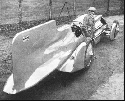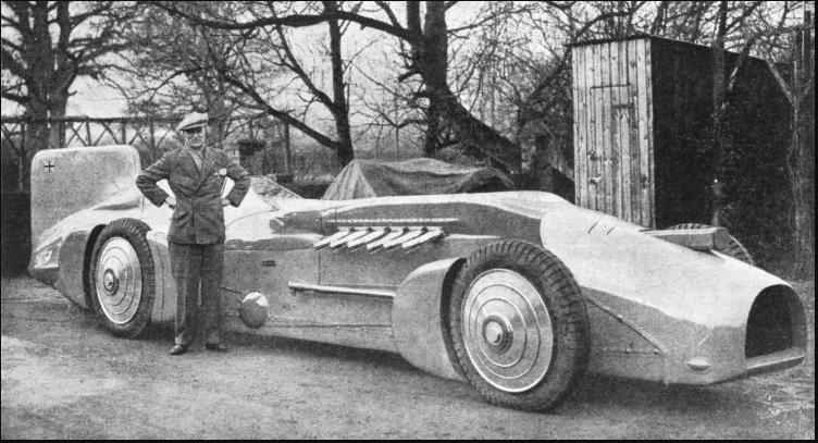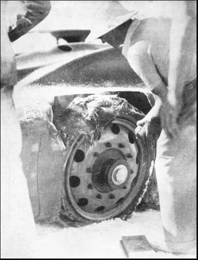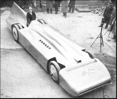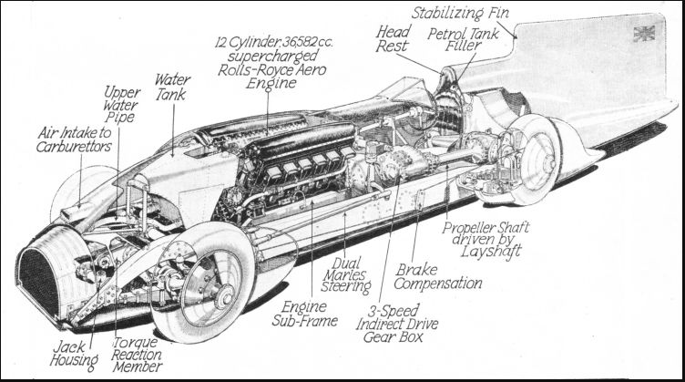 The design of the chassis frame was perfectly normal throughout. The designer stated that the general conditions in which it had to function were no more arduous than those faced by the ordinary 3-tons lorry, and the extremely short life required of working parts such as driving shafts enabled a lower factor of safety to be used than would be stipulated for an ordinary vehicle. The fact that the general design of Blue Bird bears such striking resemblances to that of a normal motor car is a vindication of the statement that record-breaking is of real value to the designer of a car to be used for more ordinary purposes. Apart from the Rolls-Royce Schneider Trophy engine, which, admittedly, bears little resemblance to that of a modern touring car, the main features of the chassis differ surprisingly little from those of general automobile engineering practice. Even the clutch and gearbox were designed on normal lines. The clutch had nine driven plates of carbon steel, on to which were riveted the fabric linings. It was of remarkably small size, considering the tremendous torque which it had to transmit. The gearbox also was conventional in design, although the forces present were sufficient to give the driver's hand a considerable jar if he made an error in timing his gear-changes. The road wheels were of the disk type, with 10-stud fixing, as used on ordinary commercial vehicles. The rims were turned from ring forgings of nickel-chromium steel because of the high inflation pressure of the tyres—120 lb. per sq. in. The overall length of the car was 26 ft. 7 in. and the overall width 6 ft. 11 in. Its height to the top of the cylinder blocks was 3 ft. 9-1/2 in., and the total weight was 10,900 lb., or nearly 5 tons. The car carried 28 gallons of fuel, 27 gallons of water and 10 gallons of oil. The rear tyres had a diameter, when inflated, of 37.6 in., and it was calculated that at a speed of 300 miles an hour this would increase to 38.2 in. The fabric section of the tyres was 7/8 in. thick, the tyres being nearly all cord, covered with an exceedingly thin sheet of rubber. Such was the xBlue Bird which achieved a speed of 272.11 miles an hour in 1933. People were already beginning to prophesy that Campbell had reached the limit, when he decided that xBlue Bird should again be rebuilt. The rumour went round that a speed of 300 miles an hour was his objective, and that nothing less would satisfy him. The old car had already proved itself capable of such a speed, but wheel spin had been the limiting factor. Once again it was decided to modify the existing car and to use the same type of engine. The problem of adhesion was tackled by the provision of pairs of twin rear wheels. The rear axle, having shown signs of weakness, was redesigned. As the two shafts did not emerge from the rear axle casing at exactly corresponding points, one pair of rear wheels was mounted in the chassis at a point slightly farther forward than the other. The radiator and the front of the body were entirely redesigned. The new nose was flatter than the old, and air was admitted to the radiator through a huge horizontal slit. This was equipped with a flap which could be closed from the driver's seat during the run over the measured mile, thus reducing wind resistance by a considerable amount. The whole of the streamlining was redesigned, the underneath parts now being almost flat. The carburettor air intakes were now mounted at the top of the body, to avoid the possibility of the entry of sand. The tail fin, for directional stability, was reduced in size. In appearance the new Blue Bird bore little resemblance to the older car from which it had been evolved ; but the various alterations were regarded only as "minor modifications." An interesting addition at this stage was the provision of air flaps, with an area of 4 square feet, behind the rear wheels. These flaps could be raised by the driver, and served as air brakes, slowing the car down until the time at which the wheel brakes could be safely applied. Sockets for special jacks were fitted at either end of the frame, to facilitate the quick changing of wheels.