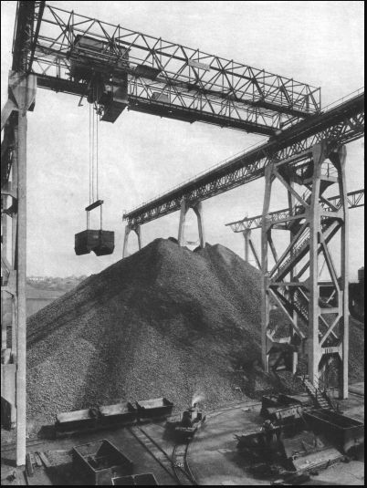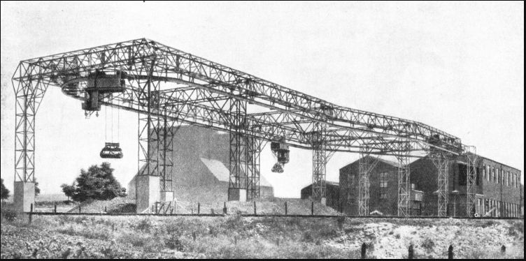 An overhead travelling crane comprises a bridge provided with wheels at either end. The wheels, driven by electric motors, run on rails laid on gantries attached to the inside walls of a building, or built up on a series of columns in the open air. The crane is provided with a driving cabin generally suspended beneath one end, and hoisting and traversing (moving lengthwise across the bridge) is performed by one or more electric crabs. The span of an electric travelling crane often exceeds 100 feet and hoisting capacities reach 250 tons. The most common termination of a hoisting cable is a hook, but this is of little use for lifting such material as coal. So a grab is substituted—a pair of hinged buckets that are lowered on to the coal heap in an open position. The grab takes a bite on the coal (about one to three tons a minute is a common rate of feeding), and the steel jaws close, carrying their load aloft to be deposited on conveyer belt or truck for transport. Pig iron and scrap iron are also awkward loads to handle with a hook, and for this class of work the hoisting cable is provided with an electro-magnet. The magnet, which may be 4 to 6 feet in diameter, is lowered over a heap of pig iron and the current is switched on. Some five tons of pig iron cling to the magnet and are promptly hoisted and dumped into a railway wagon or other receptacle. The current is then switched off and the magnet returns for another load. Some cranes "drop things" deliberately. A crane with electro-magnet on the end of the cable is used to pick up a huge iron ball which is carried to a great height. The current is switched off and down crashes the ball—but its blows, repeated again and again, are turned to useful account. Beneath the crane is a sea of scrap iron waiting to be broken up for remelting in the blast furnace.