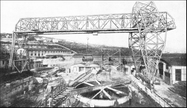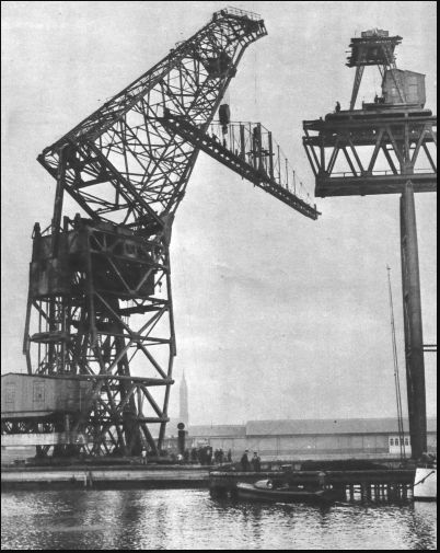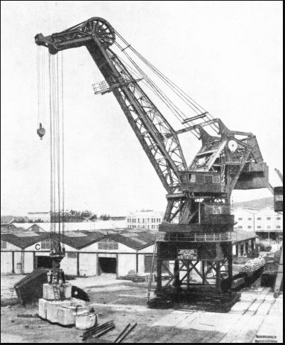 The main winding barrel is grooved and made of welded mild steel. It is 6 feet in diameter and 11 ft. 6 in. long. Main and auxiliary hoists are worked by 50-horse-power motors and special electrical interlocking gear is provided to prevent overloading of the crane beyond predetermined limits. Power is supplied at 550 volts (direct current) by a flexible cable 60 feet long. Cranes of the foregoing dimensions are somewhat uncommon for the handling of cargo, but in shipbuilding yards and fitting out berths even larger machines of different types are sometimes used. Such cranes are variously referred to as "Giant," "Goliath," "Titan" or "hammer-head" cranes. Giants, Titans and GoliathsA typical Giant crane consists of a deep lattice girder, sometimes over 150 feet long, mounted near one end on a turntable that surmounts a steel tower. At one end of the girder (or bridge) is an immense counterweight. Near the centre are the machinery room and the driving cabin. Along the projecting arm runs a travelling crab (or there may be two), with a lifting capacity of anything between 50 and 250 tons. A Titan crane is similar to a Giant, but the tower is mounted on wheels and the lifting capacity is generally limited to about 60 tons. It is used as a rule for block setting in the building of harbours and breakwaters. A hammer-head crane, as the name implies, resembles a hammer and may be regarded as a Giant crane on an unusually tall tower. The term "Goliath" refers to a large crane comprising a main girder, with its travelling crabs, supported at either end by a steel tower mounted on wheels. An electric Goliath crane at Fiume Dock, Italy, has a span of 219 feet and a capacity of 100 tons.