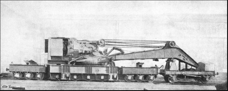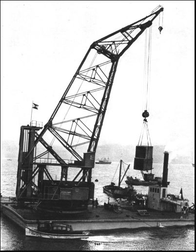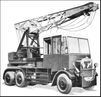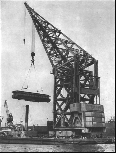 Another type of crane often used in docks is the "sheer-legs"—two enormous masts often over 150 feet high standing with widespread feet on the edge of the wharf and connected at the top so that they form a huge triangle with the wharf as the base. At the junction of the legs is a pulley block. Sometimes the triangle is luffed (or its angle altered) by ropes, but generally there is a third leg in the rear forming, with the other two, the edges of a three-faced pyramid. The sheer-legs are hinged at the lower ends and the rear leg is capable of being moved backwards or forwards so that the upper pulley block is brought "inland" or sent "to sea" at will. It is thus a simple matter to hoist, say, a boiler from the interior of a ship and place it on dry land tor overhaul, repairs or replacement. The other type of crane that finds a place in docks and harbours is the floating crane, which may perhaps be described as a "jib on a raft." Here again size is the keynote, and floating cranes deal with hoists to a height of 100 feet and more with loads up to 250 tons. The motive power may be steam, diesel or a combination of either with electric transmission. Steam engines and boilers are often fitted in the pontoon for driving the propellers and also a dynamo to supply current to the crane motors. Among the smaller machines are the portable cranes. These may run on rail or road, and are generally driven by steam or internal combustion engines. The contractors' little steam cranes are a familiar sight on excavation work. They comprise a four-wheeled truck on which is mounted a turntable carrying a steam winch, a jib and a vertical boiler that does a double duty in supplying steam to the engine and acting as a counterweight.