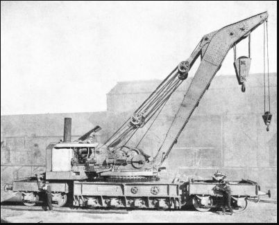 There are other types of portable, or mobile cranes intended for use on roads or in goods yards, workshops and warehouses. There is one type of mobile crane that most motorists will at once associate with misfortune. Mounted on the back of a lorry, with jib projecting over the tailboard, the mobile motor crane is sent to the scene of an accident. In a brief space of time the crane is at work clearing wreckage and hoisting one end of the damaged vehicle before towing it to the garage. A modern mobile crane for handling goods or manufacturers' materials comprises a chassis mounted on four or six wheels, or on crawler tracks. The crane is generally of the jib type, mounted on a turntable on the chassis. Power for the crane and for the road wheels is obtained from a diesel-electric power plant. Sometimes the power unit is an internal combustion engine, or the drive may be electric, with current supplied from a battery. Mobile cranes are made in a wide range of types and sizes. The "Rapier" mobile crane, which can travel on the main roads, is steered as easily as a motor car and capable of going right up to its job. Such cranes are used for many purposes inside and outside goods stations and warehouses, and also at railheads and goods yards, as they are designed to work in all weathers. The large cranes for loads up to 6 tons or more are used principally for handling metal and timber containers. Further, mobile cranes can be taken by road or rail for any distance to function at a goods depot where there may be a rush of work. For short distances by road, the crane's own power can be used ; for long distances the cranes can be placed on low platform trucks and sent by rail or by road. Railway Breakdown CranesCompactness is another important feature because of the many instances where the crane has to travel and manoeuvre in confined spaces and gangways, with restricted head room of roof ties and doorways. Careful thought in designing for various conditions has enabled mobile cranes to be standardized, so that they can be manufactured as a stock product ready for instant delivery. At the other end of the mobile scale are the four- or six-wheeled lorry cranes, with a lifting capacity up to 6 tons. Another specialized type of crane is the railway breakdown crane. A fine example of this class of crane is the breakdown unit designed and introduced by the late Sir Wilfrid Stokes and built by Ransomes and Rapier, Ltd. A typical "Stokes" unit comprises the main carriage mounted upon four axles. At either end of this carriage a four- or six-wheeled bogie can be coupled for the purpose of distributing the axle loading over a long flexible wheelbase, when the crane is required to travel in a train with its massive jib lowered and supported on a separate truck called a matchtruck. When the crane is cleared for action, the jib is raised and the bogies are quickly detached, thus leaving a short carriage with ample working space at either end. Breakdown cranes are built with lifting capacities of over 100 tons. Yet another type of portable machine is the travelling crane. Here again the range and size and utility are considerable. Travelling cranes are used in workshops for the handling of materials and machinery, in foundries for lifting moulds and patterns, and in power houses and ships' engine-rooms for lifting turbine cases and other machinery. Large warehouses use overhead travelling cranes for handling merchandise. For handling coal, iron and timber in the open air travelling cranes are used extensively.