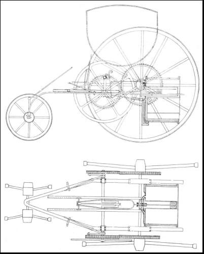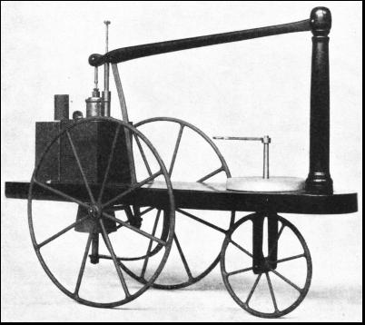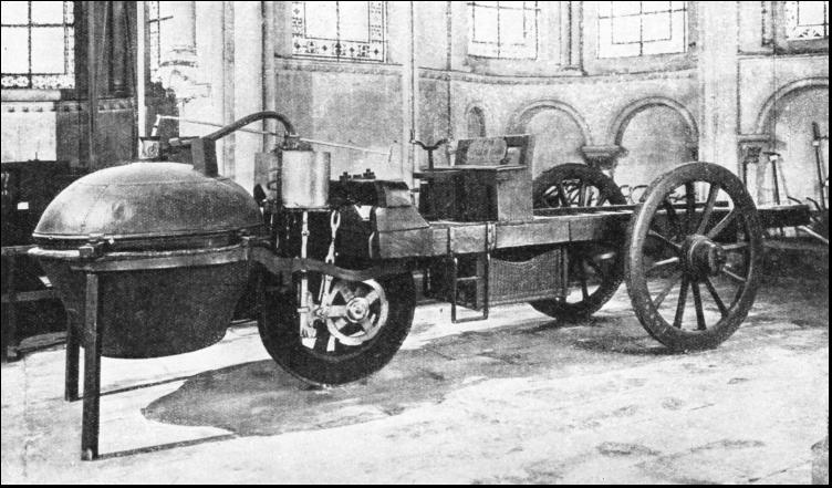 The earliest attempts at producing a locomotive—that is, any form of engine that could propel itself—concerned road vehicles. In the earliest days of the steam engine, when James Watt was a well-known contemporary figure, the only railways were light tramroads, often with wooden baulks for rails, used solely for local transport in the neighbourhood of collieries and other mines. Horses provided the motive power of these tramroads. Land transport in its widest, most general sense was carried out entirely on the turnpike roads, and the first attempts to mechanize it were expressed not in steam trains, but in steam coaches. Before and during the eighteen-thirties, when railways were becoming established and their possibilities were fully realized, enterprising engineers designed and built some successful steam carriages, which deserved to be called the first motor coaches. The first engineer in the world to produce a workable locomotive was the Frenchman Nicolas Cugnot. His invention took the form of a steam traction engine, mounted on ironshod wheels. He aimed at building an appliance which could haul heavy artillery. For such an engine any ambitious Government might be prepared to pay highly. Cugnot's traction engine appears a crude and curious machine to-day, but the inventor had to work alone. Nobody had preceded him in this branch of engineering. Cugnot's first experimental engine, or steam carriage, appeared in 1769. It ran on three wheels—a driving wheel in front and two ordinary gun wheels on either side of the frame. The little two-cylinder engine was mounted directly over the driving wheel and derived its motive force from a boiler forming the nose of the vehicle. This boiler resembled a large copper kettle without a handle. The steam pipe took the place of a spout and a small firebox was placed inside the bottom of the "kettle," with a flue passing through it to two small chimneys. The pressure was low, but Cugnot succeeded in making his strange machine propel itself. It was a far call from this to the racing car of to-day or to the heavy crawler tractor, yet Cugnot's engine can be justifiably claimed as the common father of both. People at the time thought the inventor was mad, but he realized the possibilities of his invention. For the first time, man had succeeded in making a vehicle move under its own power.