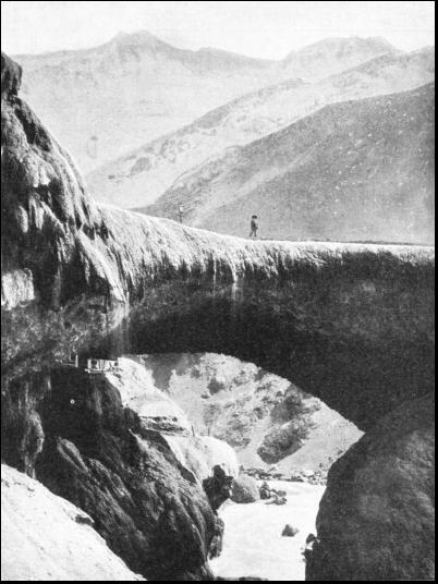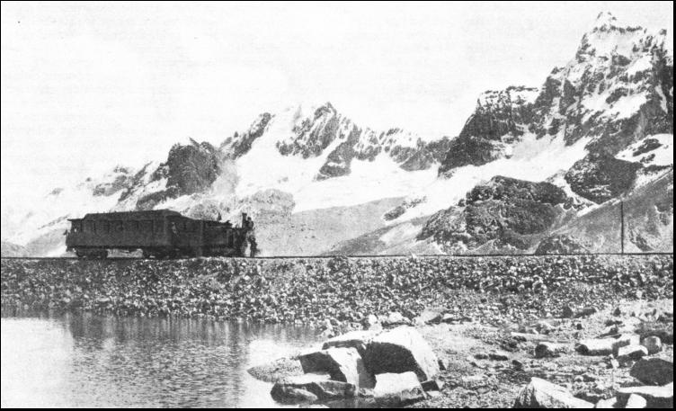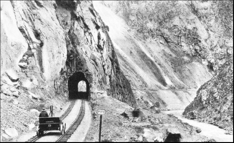 To reach this ledge the engineer used for the first time a development which became known as Meiggs's V-switch. He took the track as far up and along the face of the mountain as he could, and then took it backwards and upwards in a zigzag traverse until it reached the ledge above. The train negotiates a V-switch by the simple process of reversing. Having reached a dead end, the locomotive is coupled up to the other end of the train, and then toils on along the uppermost tail of the V. As he proceeded into the heart of the mountains, Meiggs was often to adopt this means of climbing to a higher level within a short distance. Up and up he carried his grading, blasting his way through outcrops on the mountainside, building out terraces to bear the line across the flanks of slopes which were little less than precipices. Other natural difficulties began to assail the line. Mountain sickness, or sorroche, which resembles sea-sickness and is equally distressing, assailed most people coming up from the coast. It is caused by the tenuity of the atmosphere at high altitudes. Disease of another kind, however, was to attack the plucky toilers, with far more terrible results. Some fifty-three miles from the coastal terminus it was necessary to throw a span across the Verrugas Canyon. The bridge was to be 575 feet long, and the river in the bottom of the canyon was 252 feet below the level of the road bed, the superstructure being supported in the middle by a huge masonry pier 50 feet square at the base. Beset by tremendous difficulties, Meiggs and his men had half finished this difficult work, which was carried out at a height of 6,000 feet above sea level, when a strange illness began to attack the workers. Nobody then knew what it was, but it claimed its victims from native and white man alike. The disease is now known to be due to a parasitic worm living in water. Had this illness struck Meiggs, it is probable that the work would have remained unfinished, but, finding himself immune, he never slackened his will. As the men died before his eyes, he offered higher and higher wages to all who would come and brave the risk. He succeeded. The bridge was built. Master and men pushed on through the mountains. "Little Hell Gorge"The farther they went, the greater grew the odds against them. It is said that at this stage they were using 500,000 lb. of explosive a month to blast the way before them. Tunnel after tunnel they bored, and V-switch after V-switch stepped the line up the sides of the mountains. Within a space of fifty miles, they pierced the outflung flanks of the mountains with nearly sixty tunnels. A little beyond San Mateo they had to carry the track across the aptly-named Infiernillo ("Little Hell") Gorge. It was flanked on either side by perpendicular walls of rock. Meiggs had to pierce these walls with two tunnels. Between the tunnels he used suspended cradles for the men engaged in building the bridge, for there was no foothold whatever on the sides of the cliffs. Immediately beyond this place, he found only one possible path, and that was occupied by a surging mountain torrent. He bored out a tunnel at a lower level to take the flow of the waters, and then founded his road on the dry river-bed. By 1877 Meiggs and his brave workmen had reached Chicla, some eighty-seven miles from the coast, in the course of which they had carried the track to an altitude of 12,250 feet above the level of the Pacific. It was then that tragedy occurred. The continued exercise of his will-power, the strain of incessant overwork, and perhaps as much as anything the dearly-bought conquest of the Verrugas Canyon, broke even the iron constitution of the master engineer. Desperately ill, he was hurried down to Lima. There he died, on September 29, 1877.