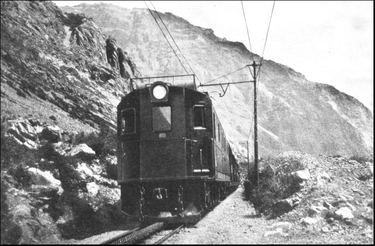 In 1868 the Government awarded him the contract for carrying a line of railway from Mollendo to Arequipa, and this was followed by contracts to continue it from Arequipa to Lake Titicaca, crossing the Cordilleras at a height of 14,668 feet, with a connecting line to the old Inca capital of Peru, at Cuzco. It is typical of Meiggs's character that he celebrated the awarding of these contracts by entertaining the President of the Republic and two thousand other guests to a banquet. This, then, was the man who was chosen to build the great route into the heart of the Andes, the Callao, Lima and Oroya Railway, which to this day remains the highest standard-gauge main-line railway in the world. The building was a colossal task, but the line, now known as the Peruvian Central Railway, remains a monument to Meiggs's courage and skill. At its summit-level the line reaches an altitude of 15,865 feet above the sea. Meiggs contracted to build this amazing railway, attaining its great altitudes within a relatively short distance from the coast, as a means of connecting the mines at Oroya with the sea at Callao, close to Lima,. His ambitions, however, went much farther than this. He visualized his railway stretching right across the great chain of the Andes into the Amazon Basin beyond, down the Amazon Valley to a point where the river was navigable for the largest ocean-going steamers. He imagined a transcontinental route which would put an end to the hazardous business of rounding the Horn—in those days the only practicable way of reaching the Pacific Coast from the great cities of Brazil and Argentina. This was to be no makeshift railway, but a well-planned, well-built standard-gauge artery, equal in carrying power to the Pacific Railroads in the United States, and far overshadowing them in the boldness of its conception. Meiggs's V-SwitchMeiggs began his huge task in 1870, and at the end of a year had finished fifty miles of grading and embankments, twenty miles from the seaward end having been already metalled. This was comparatively easy going, though the route rose from the coast without a single level section. Meiggs carried the route up the Rimac Valley into the Cordilleras and at Chosica, a bare twenty-five miles or so from the coast, had reached an altitude of 2,821 feet above sea level. The situation of Chosica resembles a gateway into the heart of the mountains; for beyond it the valley widens out again. Up this, Meiggs took his track until the colour and luxuriance of tropical trees had been left behind, and he was faced with the full resistance of the mountains to his penetrative efforts. In those days the constructional engineer, in such a region as this, had little means at his disposal for excavating and grading his road. This had to be done in advance of the laying of the permanent way. The engineers had no huge mechanical excavators such as we know, and their means of local transport consisted of mules and pack llamas. At a point some forty-six miles from his starting-place Meiggs was faced with a solid mountain wall, which most engineers would have given up all thought of scaling. It was impossible to drive a tunnel through the mountain, for there was nowhere for it to emerge on the other side. Far above the level of the railhead, however, a parallel ridge scored the face of the giant cliff.