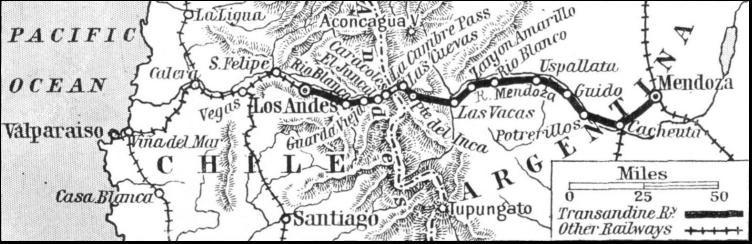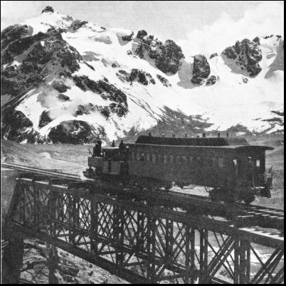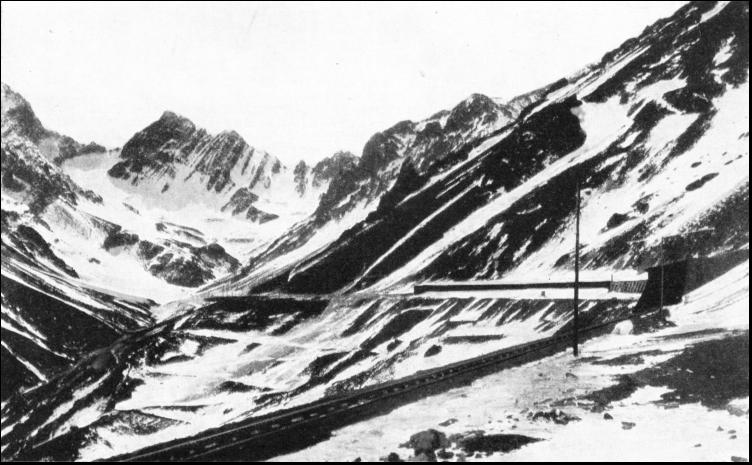 The spirit of the enterprise was gone. Two years later war broke out between Peru and Chile, and the few half-hearted efforts at completion which had continued ceased abruptly. For eleven years the works remained virtually derelict, an apparent failure. Then they were bought by the Peruvian Corporation, which still operates them, and which installed another Philadelphian, William Thorndyke, in charge of operations. From Chicla the new chief carried the line up a tremendous quadruple switchback, by which it climbed 644 feet within a space of three-fifths of a mile. The length of the tracks up this switchback was a little over three miles. Thorndyke pushed on along the way mapped out by Meiggs, at one place bringing his track out on the mountainside nearly 1,000 feet above its lower level, the two tracks being plainly visible from each other. Finally, at a height of 15,665 feet above sea level, he pierced the watershed of the Andes with the now world-famous Galera Tunnel, through a hard mountain mass nearly a mile across. With blasting and drilling the men went to work, while mountain sickness, severe at this great altitude, did its best to conquer them. The middle of the Galera Tunnel marked the summit of their line ; they had reached the edge of the Amazon Basin. The tunnel thus drains into the Pacific on the one side and into the Atlantic on the other. The bitterest struggles were over, and it was with relative ease, once the tunnel was pierced from end to end, that they carried their line down the valley of the Yauli, one of the innumerable tributaries of the Amazon into Oroya, 12,225 feet above sea level. The first great highway across the watershed of the Andes was complete at last. Three Miles HighOne of the peaks of the huge range was named Mount Meiggs, but the true monument to Henry T. Meiggs, finished by Thorndyke in the year 1893, was the Callao-Oroya Railway, for which Meiggs had given his fortune, his health and in the end his life. Modern developments of this route include a branch from Ticlio to Pachachaca, reaching the maximum summit-level of 15,865 feet. From Oroya, too, an extension was built to Huancayo in 1908. Thus this great work, brought into existence after so much exertion, continues to-day, a busy artery for the traffic in copper from the Oroya mines to the coast. Where once sounded the detonations of blasting, the silences of the Andes are now broken only by the deep whistle and sharp exhaust of a locomotive climbing up to the Galera Tunnel. If the history of the Callao and Oroya line met tragedy in its building and triumph in its completion, that of the Transandine Railway from Argentina into Chile has shown a reversal of the process. In this instance, the engineers seemed to have conquered Nature, when Nature hit back. The builders of the Transandine succeeded in attaining the goal aimed at by Meiggs—the linking of the Atlantic and Pacific coasts of South America by a continuous medium of transport, so that traffic between the countries east and west of the Andes would no longer have to be conducted round Cape Horn or up and over the Isthmus of Panama.