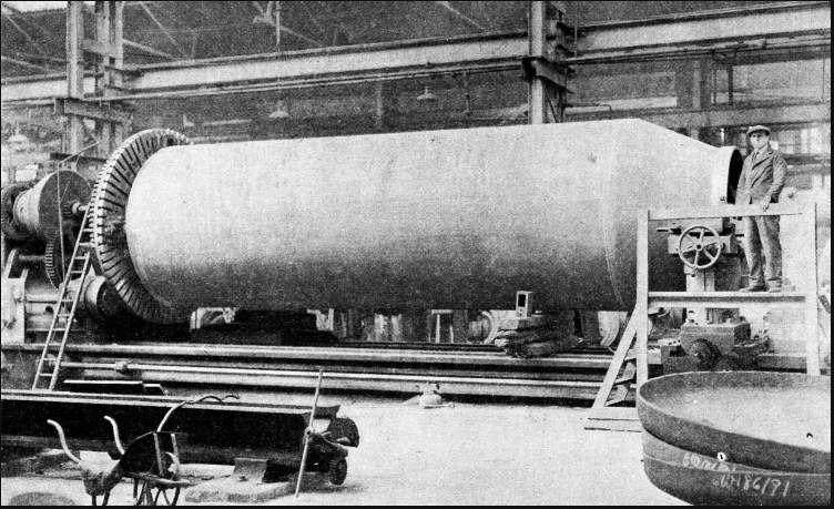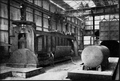 Although there are many different types of boilers for generating steam at pressures which may range from 50 lb. to 1,000 lb. per sq. in., virtually all are made up of one or more steel drums or shells, generally with a number of fire tubes or water tubes. Thus the main methods of manufacture have much in common for all types. For steam pressures up to 250 lb., and when it is advantageous to have a boiler containing a large volume of water, one or other of the various kinds of "shell" or "tank" boiler is generally used. These include the Lancashire, with its two flue tubes ; the Cornish, with a single flue ; the "Economic" boiler, which contains also a number of fire tubes, generally placed above the flues ; and the Scotch marine type, which has a somewhat similar arrangement but is generally of much larger diameter than the "Economic" boiler. Then there are also a number of types of water tube boiler. Water tube boilers are generally adopted where steam pressures are relatively high; they are now used in all the more modern power stations at from 400 lb. to 650 lb. pressure. Certain special types have been made for pressures up to as much as 3,000 lb., in which event they are built almost entirely of tubes of small diameter. The differences in the methods of manufacture of these various types are mostly due to the steam pressures and temperatures at which the boilers have to work. The most common type, which might be taken as a fair example of. boilermaking, is the ordinary Lancashire boiler. The maximum size of this type made in standard form is about 9 feet in diameter and about 30 feet long. Lancashire boiler are built to stand working pressures up to 250 lb. First, a definite specification is drawn up by a responsible authority, and the essential requirements as to strength of materials, thickness of plates and tubes, and so forth, have to comply with standard regulations issued by the Board of Trade and by the insurance companies interested. The steel of which the plates and tubes are made has to pass stringent physical tests, such as those for tensile strength, shearing strength, elongation and the like. These tests are generally carried out at the steelworks, but most of the leading boiler manufacturers have their own laboratories where the tests can be made.