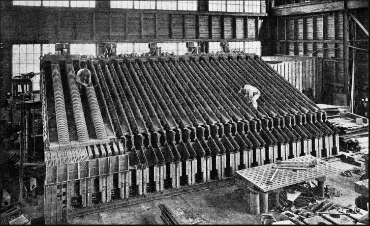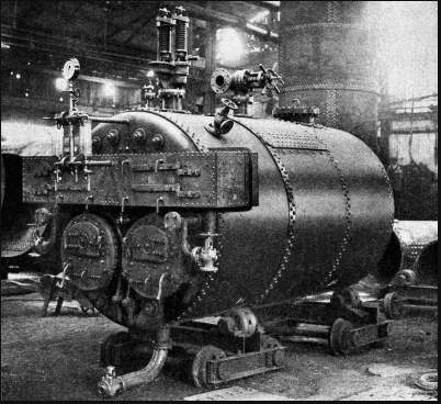 While these operations have been proceeding the flues have been going through their own process. The plates from which they are made are first planed in an edge-planing machine. They are then rolled approximately to the proper circle as they still have to be welded along the seam. This operation is generally done by a special water-gas welding machine, which does the work more quickly and satisfactorily than would be possible by hand. The flue section is secured by a tie strap clamped across the two sides of the seam edges of the plate, to prevent the plate from springing apart when under treatment. It is then placed horizontally on the floor carriage of the machine, with the seam uppermost. The machine consists of two long rigid cast-steel arms, at whose outer end are carried two cast-iron rollers so that the flue section can pass between them. The roller on the lower arm turns on a fixed axis, but that on the top arm is provided with a vertical movement and can have pressure applied to it by a hydraulic ram fixed to the end of that arm. For heating the part of the flue to be welded, a large rectangular burner, lined with firebrick, is suspended above the top side of the flue, and another is fixed inside the flue just facing the top burner. Water gas is fed to the burners and the amount of heat is controlled by the use of pyrometers. As soon as the proper welding heat has been reached the flue is moved so as to place the heated portion directly between the upper and lower rollers. While the heated portion is resting on the bottom roller the top roller is pressed down hard on to the weld by the hydraulic ram, and the flue is moved backwards and forwards along the weld, the rollers thus smoothing it out. The whole seam is thus completed in this progressive manner. The Flanging OperationThe flue section is now in a parallel cylindrical form, and still has to be flanged at the ends where riveted to an adjacent section. The flanging operation may be done in a vertical position by one form of flanger, or it may be carried out in what is virtually a simple chuck lathe. The end of the flue to be flanged having been previously heated to a suitable heat, the flue is quickly fixed in the chuck and made to rotate. At the other end of the machine is a roller fixed on an axis which can be rotated in the arc of a circle through about 90 degrees. The roller, at first in a horizontal position parallel to the axis of the flue, is made to press on the inside surface of the hot end, and is gradually moved round the arc until it is at right angles to the starting position. By the exertion of pressure on the roller the flue end is swaged over (shaped by pressure), at first taking a bell-mouth shape, finally to be bent over until it is at right angles to its axis. The other end having been treated in the same way if both ends are to be flanged, the flue is then placed in an annealing furnace to be treated, thereby neutralizing all the stresses which have been set up during the various processes through which it has passed. Sometimes one or more of the flue sections are made with circumferential corrugations of certain standardized forms. This not only increases the heating surface of the flue, but also strengthens it considerably, so that corrugated sections may be made longer than the plain ones and with fewer riveted joints. The corrugations also provide for expansion and contraction of the flues when fixed in the boiler and subjected to great ranges of temperature. The corrugated flues are at first made in the same way as parallel plain flues, so far as the welding of the seam is concerned. The flue is then again heated and placed in a special design of roller machine, whose rolls are made with the shape and size of corrugations required for the particular flue in hand. The top bearer frame of the roll is lifted off, the hot-flue is slipped over the operating-roller and the top housing is replaced in position. The flue is then rolled until it has taken on the full corrugations. It is then removed and flanged in a similar manner to the plain flue, after which it is placed in the annealing furnace.
