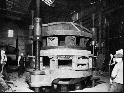 For example, the material for a Lancashire boiler of say 9 feet diameter, 30 feet long and for 150 lb. working pressure, would have to meet the following test conditions. The main shell plates would have to have a maximum tensile strength of from 28 tons to 32 tons per sq. in., with a minimum elongation of 20 per cent in a length of 8 in., thereby ensuring ductility. The plates for the ends and the flues would be slightly under this tensile strength, but with rather more elongation. The rivet steel must have 25 tons to 30 tons tensile strength, with an elongation of not less than 25 per cent in a length of 10 in. The factor of safety allowed in designing the dimensions of all parts under pressure is generally about five. That is to say, the strength of such parts is, as built, five times the strength required to stand the stresses to which they will be subjected in normal working conditions. When the steel plates, of required thickness and approximate size, are received in the boilerworks they are first put into a plate edge-planing machine, which planes the edges to the exact length and width. A few "tacking" holes are then drilled in the plates to hold them together during the main drilling operation. These tacking holes also enable the butt straps to be fitted directly the plates have been rolled to the required shape. The steel plate is then put into powerful vertical rolls, which bend it round to the desired circle. Such rolls deal with plates up to about in. thick. In some instances plates from 2-1/2 in. to 3-1/2 in. thick have to be bent to shape, and the operation is then carried out in a hydraulic press which does it in stages. Bending either by roll or by press is generally done with the plates cold, except with unusually thick plates. Ensuring a Perfect RivetWhen the main shell plates have been rolled they are placed in a drilling machine. If all the rivet holes were drilled in each section separately, and then bolted together for the riveting operation, it is possible that some of the holes would not come quite into line with the corresponding ones on the plate which had to be riveted to it. The plates are therefore held together by a few bolts in the tacking holes and the remaining rivet holes are then marked off. After this the shell plates, end plates and butt straps which cover the longitudinal seams are drilled at the one setting, so that every hole is true right through the two plates and a perfect rivet is assured. Before riveting, however, the assembled plates are taken adrift, so that any burrs or ragged edges left round the holes from the drilling operation can be dressed down, and any drill chippings which may have got between the plates may be removed. This precaution ensures perfectly clean surfaces so that when the plates have been riveted together they will close up. In Lancashire boilers the end plate may be flat, and secured to the shell by an angle-iron ring and stiffened by gusset plate stays, or, as is now more general, it may be a dished plate. This form of construction makes a cleaner job, and eliminates the gusset plate stays required for the flat end. Water tube boilers, which work at higher pressures, always have dished ends, although the drums are much smaller than those in the shell type of boiler. For the dished end, the plate is first cut roughly to size and then heated in a furnace to a suitable heat for heavy pressing. It is then placed in a powerful hydraulic press, capable of exerting a total pressure of about 600 tons. Cast-iron dies, to give the plate the desired shape, are fixed to the head and table of the press, one above the plate and the other below it. The dished form is generally completed in one pressing. There are, however, two flanged holes to be made in the plate, into which holes the two flues are fixed. These holes, varying in diameter from about 2 ft. 6 in. to 3 ft. 9 in., are then cut to a size which will, after having been pressed, be the correct size.