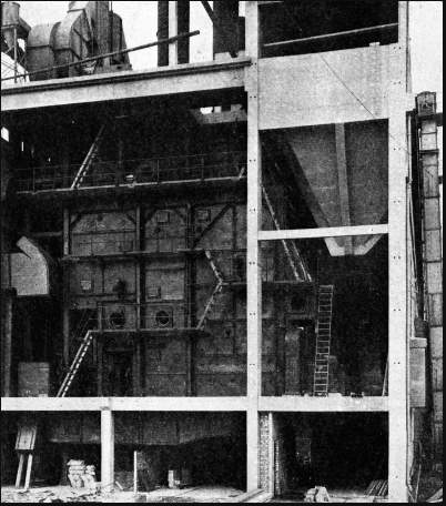In this instance the steam and water drums may be made in much the same way as the shell of the Lancashire boiler, but, being of much smaller diameter, they can sometimes be made in one long single drum. This may be electric fusion welded along the longitudinal and circumferential seams. The electric fusion welding of high-pressure boiler drums has reached such an advanced stage that it is now possible to see right into the weld by X-ray apparatus specially designed for the purpose. When the ends are made separately from the drums, they are always of the dished type, and are carefully machined round the outer periphery. The corresponding part of the inside of the drum end is also machined, so that the two surfaces fit exactly all round, before being riveted up. The drums have then to be drilled for the hundreds of water tubes which have to be fitted to them. The tube holes receive a final boring with a tool which gives a finely machined finish to the surface. This is of utmost importance when the tubes are being expanded into the drum, as it secures a satisfactory steamtight metal-to-metal joint between the two surfaces. Some types of water tube boilers use only straight tubes, some have more or less bent ones, and others use a combination of both. The advantages of tubes bent at the ends are that this construction enables the tubes to enter the shell of the relatively small drum as nearly as possible at a right angle, thus securing a uniformly shaped hole. So long as a straight tube is led from near the centre of one drum to a corresponding position in the drum at the other end, the holes will be square to the drum ; but as they get farther round the periphery of the drum they enter it at an increasingly acute angle, making it more difficult to obtain a good joint. Another advantage claimed for the bent tube is that it allows more flexibility for expansion due to changes of temperature. Powerful Wedge ActionThe bending is performed in a cold state in a power-operated tube-bending machine, which does the work without flattening the form of the tube at the bend. One well-known type of boiler using straight tubes is of somewhat different construction, the tubes not being expanded into the drums. To either end of the steam drums is connected a series of inclined vertical corrugated headers, into which the tube ends are expanded. Caps in the headers opposite the tube ends provide access for cleaning and inspection. The tubes for water tube boilers are made from the best mild steel, having to stand, on the fire side, high temperatures. In many instances the tubes are subjected to 1,000-lb. hydraulic test, according to the working pressure of the boiler. It is of considerable advantage to have the fewest possible different shapes of bend in the tubes of any one boiler, so that the number of spare tubes to be kept can be a minimum. The expanding of the tubes is done by a special tool comprising three or more hard steel rollers mounted on a central mandrel. These are made with a slight taper, so that, as the tool is pressed into the tube end and rotated, it has a powerful wedge action in expanding the tube end against the sides of the hole in the drum. For large tubes, or when many tubes are to be treated, the expanding tool may be driven by a small compressed-air motor. The extent to which the water tube boiler is completely erected in the maker's works will depend on its size. It may be partly assembled at the works, but much of the assembly of the larger boilers has to be left until finally delivered on site. In the modern large power station installation there are so many accessories such as economizers, or water heaters, steam superheaters, air heaters, forced-draught or induced-draught equipment and so on, that in a drawing of the layout of such a plant, the boiler appears to be only a small part of it, though it does most of the work.