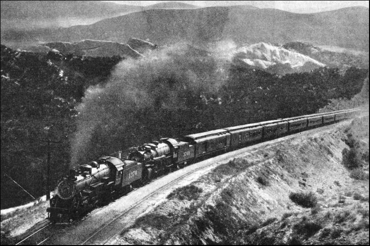 Passing through the sleeping-cars you notice that sleeping sections, drawing-rooms and compartments are so well contrived that they may be booked by the suite ; indeed, the "Chief" is little less than a travelling hotel, so well is it designed and organized. The formation of suites is flexible, to accommodate family parties of mothers and fathers and children, with or without a personal maid, and various-sized family parties. This variability is achieved by the grouping in one car of six compartments and three drawing-rooms ; in another, seven drawing-rooms ; in still another, three compartments and two drawing-rooms, and so on. At the rear of the train is the observation super-parlour car. Its settees and chairs promise ease and relaxation. It suggests a luxury comparable with that of a first-class hotel in any part of the world. In this part of the train there is also a lounge reserved for the use of women passengers, and a shower-bath for women and children only. A maid travels with the train to attend to the needs of the feminine travellers, a negro maid—as is the custom there—all shiny and clean, and ever ready to respond to the demands for service. The Santa Fe "Chief" traverses the heart of romantic America. If you have once travelled on it you will inevitably want to repeat the experience, for the route taps the most remarkable scenery, including fertile farming sections, areas rich in mineral wealth, the arid wastes of the Mojave desert, the extraordinary district of Death Valley—and many other geographical features. The train, too, is under one management all the way, and this makes for smoothness of running and general economy. If you "stop off" at Albuquerque it is likely that you will make detours to see the Indian country ; but you may pick up the "Chief" on any following day. One of the attractive features of the Santa Fe line over which the "Chief" runs regularly every day is the variation in altitude covered by the line. Just before Raton, on the westward journey, the Raton Tunnel stands at 7,622 ft. above sea level, and much of the elevation of the track is above the 5,000 ft. level. You may leave Chicago at 11 a.m. in the morning and you will arrive in Los Angeles (which being translated means the City of the Angels) on the third day out at 5 p.m. If you are going on to San Diego you will arrive in that city four and a half hours later. It is fitting that the railway world should salute the "Chief."