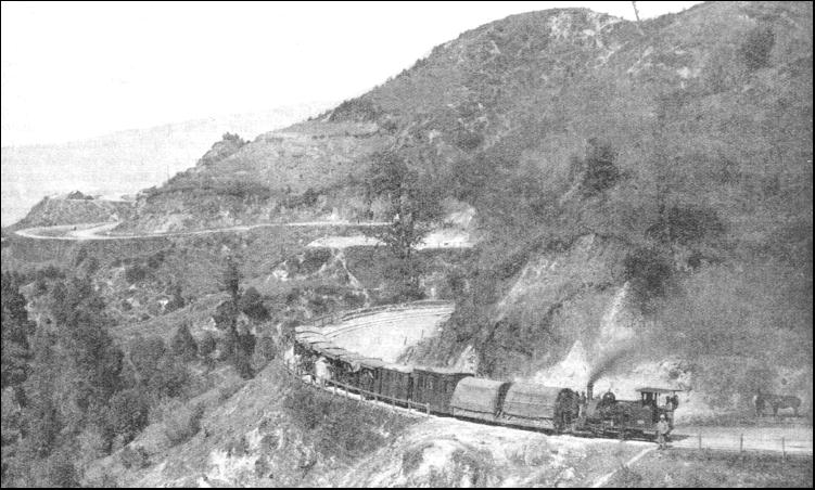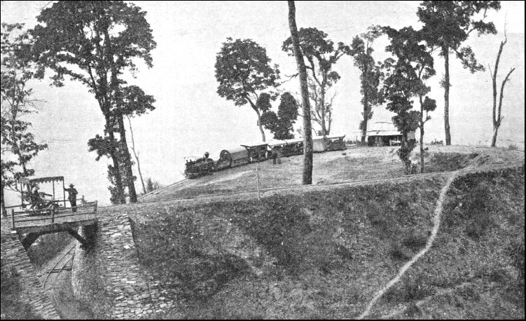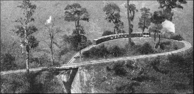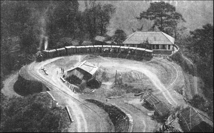 The fact that it was decided to work the line by adhesion on the narrow gauge of 2 ft. restricted the weight of the trains, but there is nothing of a "toy railway" about the construction of the line or about the amount of passenger and goods traffic that it carries. Steel rails weighing 41-1/4 lb. per yard were laid on wooden sleepers. For the first seven miles from Siliguri station the gradient was easy, the ascent to Sookna station (533 ft.) being at 1 in 281. The heaviest piece of work in this section was the erection of a steel bridge, 700 ft. long, in seven 100-ft. spans, across the Mahanuddy River. This river has its source in the line of mountains ahead of the traveller known as the Mahaldirum Range, with an altitude of about 7,000 ft. The river at this point forms a boundary between the Terai, the jungle tract at the foot of the Himalayas, and the district of Julpaiguri. It is a tributary of the Ganges. The train passes streams and tea gardens on the way to Sookna. When the jungle was being cleared the area was fatal to many Europeans, a number of whom died from fever. It is at Sookna that the real ascent begins. After passing the ninth mile-post, the train encounters the first sharp curves. Then a fine view opens out to the south, displaying a vast horizon, and the passenger notices how rapidly he is rising above the plain. Passing through giant bamboos and screw-pines, the train reaches the first spiral, or loop. The engineers had to conquer an altitude of 871 ft. in the four and three-quarter miles from Sookna to Rungtong station (1,404 ft.), which is at the twelfth mile. Four and a half miles from Sookna the sudden ascent made a spiral unavoidable. The track described a sharp spiral through a deep cutting to gain the higher level. Four years or so after this had been constructed the rains of 1883 caused a slip of rocks and earth which fell into the cutting, completely filling it. This misfortune was turned to good account. The engineers had discussed re-aligning the section to reduce the gradient, and when the landslip compelled them to repair the line they eased the gradient, making a new track some distance below the original road.