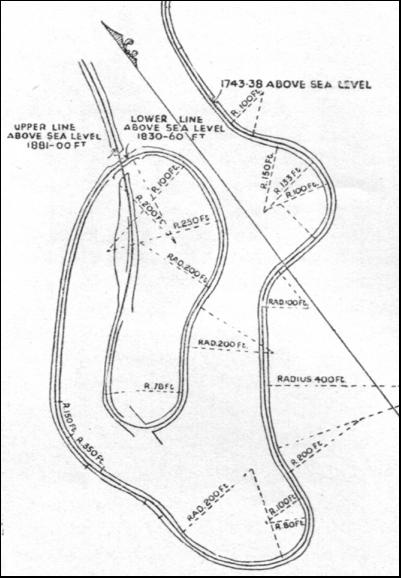 Soon after Rungtong station the line turns nearly south on to a long spur where another spiral is encountered. This spiral begins just before the fourteenth mile-post, and is one of the most complicated and interesting pieces of engineering on the railway. From Rungtong the line has to ascend to Tindharia station (2,822 ft.) in less than eight miles, the average gradient for this section being 1 in 28-3/4. To overcome a sudden rise of 137 ft., there is practically a double loop, the outstanding feature of which is a sharp curvature introduced to fit the alinement to the situation. This second loop is a fine feat of engineering. The track, now returning northwards and eastwards for a short distance, runs along the old road, but gradually passes below it, until the third loop is reached at the sixteenth mile-post. Fine views are afforded of the valley below, the Bhutan Range to the eastward, and the adjacent hills and valleys. In the plains to the south-east can be seen the Teesta River, with an island called Tiger Island, because three tigers were once shot during one "beat" there. The river has its source in the Tibetan Lake Chalamu, which is 17,000 ft. above sea-level, and about seventy-four miles north-east of Darjeeling. At the eighteenth mile the country presented such difficulties that a spiral was impracticable, and a reverse had to be adopted. At an altitude of 2,438 ft., the line, climbing at 1 in 28, enters a curve of 800 ft. radius, followed by one of 400 ft. radius, and reaches a dead-end at 2,473 ft. It then backs up a second leg, rising at 1 in 33 round curves of 400 ft. and 200 ft. radius respectively, to a second dead-end at 2,501 ft. Another climb at 1 in 28 round a curve of 400 ft. radius brings the train to 2,536 ft., so that by means of the reverse or zigzag a total vertical lift of 98 ft. is accomplished. Tindharia station is considered to be above the Terai fever level. The workshops ot the company are here. In the section of just under four miles between Tindharia and Gyabari stations the heaviest average gradient, 1 in 28-3/4, has to be faced. After a zigzag outside Tindharia station comes the fourth and final spiral or loop This is generally regarded as the most sensational spot on the line, and is called "Agony Point." It represents the ascent of another of the conical spurs which are common in the locality. Originally there was so little room that on the upper part of the loop a curve of 59-1/2 ft. radius had to be described, the train practically overhanging the hillside at this point, but improvements were carried out later and the curve was somewhat eased. The train passes "Agony Point" and proceeds, encountering another zigzag just before Gvabari station. The station stands at an altitude of 3,516 ft. Just beyond it the fourth and last zigzag, or reverse, is negotiated, and the gradient becomes slightly easier, 1 in 32 lor the succeeding four miles to Mahanuddy, 4,120 ft. above sea-level and twenty-seven miles from Siliguri.
