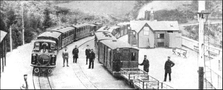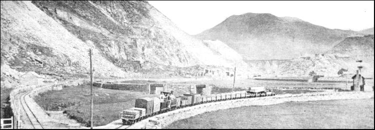 An interesting sight is a train of trucks loaded with slates, sometimes as many as fifty or sixty, travelling down the line without an engine. These trains are controlled by hand brakes on trucks at intervals along the train, which are operated by brakesmen who run along the tops of the trucks to put them on or take them off according to the gradient. A long line of empty trucks is brought up the line behind the coaches of passenger trains. Central buffer couplings are used throughout, and the maximum weight of a train is about 190 tons. Locomotives Nos. 1, 2, 4, 5, and 6 were still in use in 1935 for goods traffic, not in their original form, but reconstructed with saddle tanks. Over seventy years of service is a remarkable achievement. The Festiniog Railway claims to be the first narrow-gauge railway in the world. It aroused such interest that in 1870 a Royal Commission, presided over by the Duke of Sutherland and attended by representatives of many foreign countries, inquired into its working and efficiency. So satisfactory was the report of this Commission that before ten years had elapsed well over 10,000 miles of narrow-gauge railways had been constructed in India and other countries. Portmadoc, the coastal terminus of the Festiniog Railway, is also on a branch, formerly of the Cambrian Railways and now of the Great Western Railway, which runs along the coast of Merionethshire and Caernarvonshire from Barmouth Junction to Afon Wen and Pwllheli. Another line, the narrow-gauge Welsh Highland Railway, used to serve Portmadoc regularly until quite recently. Its tracks extend from Portmadoc past the delightful village of Beddgelert to Dinas Junction, on a branch of the L.M.S. from Bangor to Afon Wen via Caernarvon. The Welsh Highland Railway has a mileage of twenty-seven, and owns three locomotives, ten carriages, and 104 wagons. The gauge is the same as that of the Festiniog Railway.