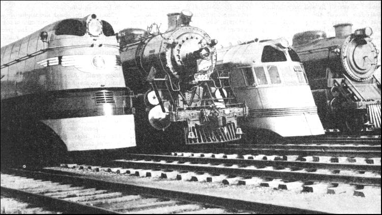 Now, however, the Pennsylvania and the Reading have joined forces, and consolidated their city-to-coast services. under the title of "Pennsylvania-Reading Seashore Lines." The "Boardwalk Flyer" to-day requires 57 minutes for its 55.5 miles run, though it is far heavier than in the days of its 50 minutes exploits. Other very fast trains of both companies connect New York and Philadelphia every hour in either direction. For the Reading Company this means that the 49.2 miles between Bound Brook and Jenkintown must be covered in a standard hourly time of 49 minutes in one direction, and 50 minutes in the other, every run including an intermediate stop at West Trenton. All the short runs on this service must thus be reeled off at start-to-stop speeds of a mile a minute ; but for the most part, the trains consist of four-car and five-car formations only. As for the Pennsylvania, a procession of flying expresses, day and night, travels to and from all parts of the Middle West, the western, and the southern states, and occupies the main line between New York and Philadelphia. This is easily the busiest main route in the world. Between Newark and North Philadelphia, thirty-two trains daily are booked to cover the 75.7 miles in times varying from 75 down to 71 minutes. Among these is the "Congressional," which with electric haulage throughout, has in 1935 for the first time brought the New York-Washington journey below the four-hour limit. The distance of 224.8 miles is now covered in 235 minutes, including stops at Manhattan Transfer, Newark, North Philadelphia, Wilmington, and Baltimore. This electric speed-up on the Pennsylvania has aroused the competitive spirit of the Baltimore and Ohio Railroad, which, with cuts of 41 and 31 minutes on its previous best timing, has brought its fastest schedules between New York and Washington down to four hours, over a route a mile shorter than that of the Pennsylvania. Streamlined locomotives and trains are being brought into use by the B. & O.R.R., not only on this service, but also between Chicago and St. Louis, where a new express, called the "Abraham Lincoln," reduces the 284-miles run from the previous 6-1/2 hours to 5-1/2 hours. This acceleration in its turn has stirred up the Wabash and the Illinois Central Railroads. The former's "Banner Blue" express now makes the run of 286 miles by the Wabash route in 5-1/2 hours, and the Illinois Central built Diesel-electric trains are scheduled to keep the same time. This brings us back to Chicago, and to what, in 1935, proved the most exciting burst of competition in speed that America had ever known. The exploits of a Diesel train were again responsible for precipitating an advance in speed so great that it has cut ten-hour schedules down to 6-1/2 hours. The cities concerned are Chicago and Milwaukee, on the west side of Lake Michigan ; and the so-called "Twin Cities" of St. Paul and Minneapolis, a little over four hundred miles from Chicago by three different routes. First of all the Chicago, Burlington and Quincy Railroad built a Diesel-operated train of three cars which it christened the "Burlington Zephyr." A remarkable inaugural run was made, in which the 1,015 miles from Omaha to Chicago were covered without a stop in 13 hours 5 minutes; 130 miles being covered at an average speed of ninety miles an hour. The C.B. and Q. then announced its intention of building two more of these "Zephyr" units, and of introducing them on the service between Chicago and the "Twin Cities." But the competitors decided to get ahead of their rivals, and to demonstrate what could be done with steam. First of all, the Chicago, Milwaukee, St. Paul and Pacific staged a journey with a 4-6-4 locomotive and five cars, in which the 85 miles from Chicago to Milwaukee were covered in 67 minutes 35 seconds, and 68.9 miles were covered at an average of all but 90 miles an hour. Already the C.M.St.P & P. had cut the Chicago-Milwaukee schedule to 90 minutes, but this was promptly pared to 85 minutes, and the decision was reached to build special streamlined locomotives and trains to make possible a much faster service, not only to Milwaukee, but to St. Paul and Minneapolis as well.