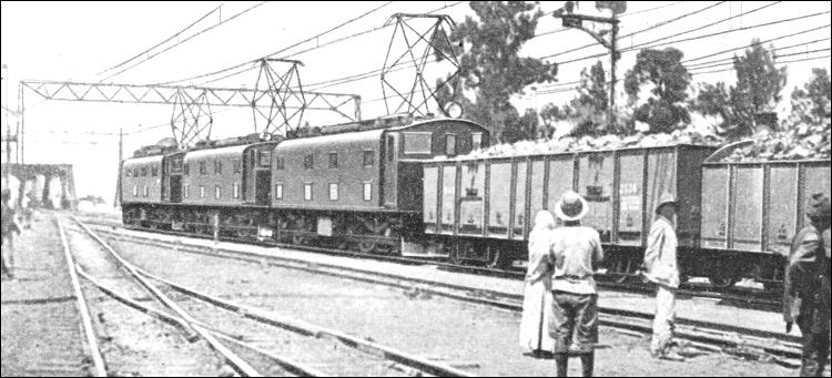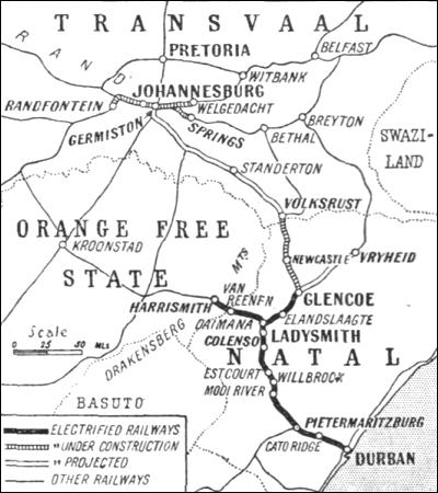 Electrical operation on the Natal railway from Glencoe to Pietermantzburg was put in hand in 1923. It is not until the gradients between these towns are studied that it is realized, first, why electric traction had to be adopted on the Natal Railway (which has a relatively low traffic density), and secondly, why work began from north to south and not from Durban, the outlet of Natal, northwards. Glencoe is the centre of the Natal coalfields, and a large proportion of the traffic south to Durban is coal for export (ship coal in large part), The fact that it pays to bring this coal 240 miles to Durban is due partly to the fact that the coal mining is surface mining, and partly to the cheap railway rates and efficient service. The railway has a hard task to perform. Glencoe is 4,310 ft. above sea-level. From here the line falls to 3,190 ft. near Colenso, the scene of the fierce battle in the South African War of 1899-1902, and to-day the site of the power station which supplies the Natal railway. From Glencoe to Colenso the railway passes Elandslaagte and Ladysmith, also famous in the war. From Colenso to Estcourt, a distance of about twenty miles, the line rises again to 3,830 ft., and thence to a summit-level of 4,980 ft. over a pass in the Drakensberg Mountains, which rise to about 11,000 ft. From this point, which is near the town of Willbrook, to Pietermaritzburg the distance is about sixty-five miles, during which distance the railway falls to 2,210 ft. From Estcourt to Mooi River (about thirty-five miles) there is a ruling gradient of 1 in 65.