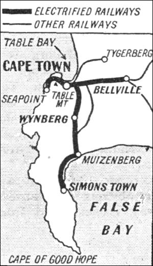In addition to this long and important main line electrification, the South African Railways and Harbour Administration operate electrically the Cape Town Suburban Railways. The transport problem of Cape Town is, for geographical reasons, a peculiar one. Cape Town itself is built on a comparatively small area between Table Bay and the almost vertical face of Table Mountain. Outside the city site, building has been still further limited by the rocky nature of the district, so that the suburbs of Cape Town, with their daily travelling population, are restricted to a narrow strip of country along the side of the mountain between Cape Town and Wynberg, and to the area between False Bay and the mountain extending from Muizenberg to Simonstown. This area lies between fifteen and a half and twenty-two and a half miles from Cape Town. The former steam service was efficient, but it became clear in 1925 that the increased traffic necessary to make the Cape Town lines pay would outstrip the capacities of the service. Electrical operation from Cape Town to Seapoint began in 1927, and from Cape Town to Simonstown in 1928. Overhead electrification at 1,500 volts D.C. was adopted, and power is taken from a specially built power station.