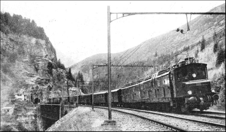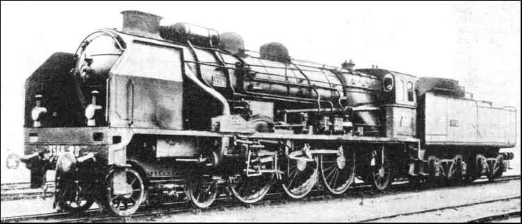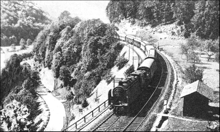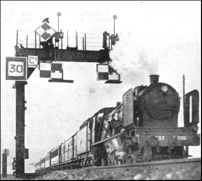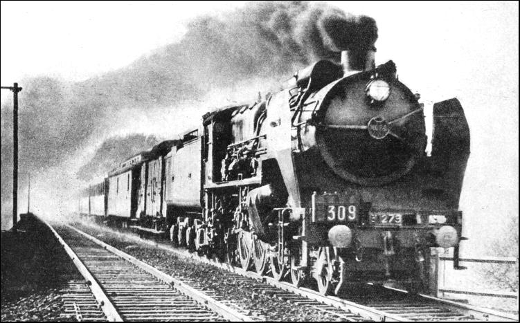 On the northbound "Sud Express" the timing of six hours twenty-five minutes from Bordeaux to Paris (Quai d'Orsay) is considerably easier, but it allows a margin for recovering the late starts which frequently result from the late arrival of the Spanish connection. Early in 1935 an astonishing record was created by the recovery of precisely one hour between Bordeaux and Paris alone, whereby the 359.6 miles from Bordeaux to Paris (Austerlitz) were covered, stops included, in five hours sixteen minutes. Two other very fast trains leave Paris fur Bordeaux at 5.25 p.m., and Bordeaux for Paris at 5.15 p.m., both are allowed six hours twenty minutes (the latter to the Austerlitz station in Paris). The northbound of these is thus only four minutes slower than the "Sud Express" itself, though a much heavier train, especially between Tours and Paris. There are numerous other mile-a-minute runs over this important Paris-Orleans main line. Another famous P.-O. train is the "Barcelona Express," which runs down through central France, via Toulouse and Narbonne, to the Spanish frontier at Port Bou. The heavy gradients and sharp curves of the route forbid the high speeds Bordeaux route, but the average of about 47.2 miles an hour over the 445 miles from Paris to Toulouse is most praiseworthy, seeing that the weight of this train often exceeds 600 tons. Electricity is responsible for the haulage for the first 313 miles of the journey from Paris to Brrive-la-Gaillarde, and the initial 127.3 miles from Quai d'Orsay to Vierzon, is covered without a stop - the longest non-stop P.-O. run - in the excellent time of 132 minutes. The principal long-distance rival to the "Sud Express" of the Paris-Orleans is the "Côte d'Azur Pullman" of the P.L.M. - another of France's all-Pullman luxury trains. It is only in the winter and spring season, when fashionable Europe is migrating to the Riviera, that this famous express operates its spectacular schedule. Leaving the Gare de Lyon at 10.15 a.m., it makes a whole series of mile-a-minute runs in succession. Stopping at Laroche, Dijon, Lyons, Valence and Avignon, it covers the intermediate stages of 96.2, 99.0, 122.1, 65.8, 77.3 and 74.2 miles in 94, 101, 117, 74, 71 and 79 minutes respectively, completing the 534.6 miles to Marseilles, inclusive of these stops, in nine and a quarter hours. Along the 155 miles of the Riviera coast the gradients are extremely steep, and the stops are frequent, so that this triumphant speed progress is brought to an end; the journey concludes at Mentone, 689 miles from Paris, at 11.15 in the evening. On the return journey the "Côte d'Azur Pullman" leaves at 9.20 a.m., makes the same stops, and is back in Paris at 10.35 the same evening. On all the other three French railways - the Eastern, the Alsace-Lorraine, and the State - high-speed steam-hauled runs may also be found. One express which is worked at high speed along the whole length of the Alsace-Lorraine main line is the "Edelweiss Pullman"; this is easily, in fact, the quickest stretch of its daily journey between Amsterdam and Basle. Coming south. it connects the historic cities of Metz and Strasbourg in a time of eighty-nine minutes, the distance being 95.6 miles, and continues from Strasbourg to Mulhouse, 67.3 miles, in sixty-two minutes. In the other direction the time allowed is sixty-one minutes from Mulhouse to Strasbourg. and ninety-two minutes from there to Metz.