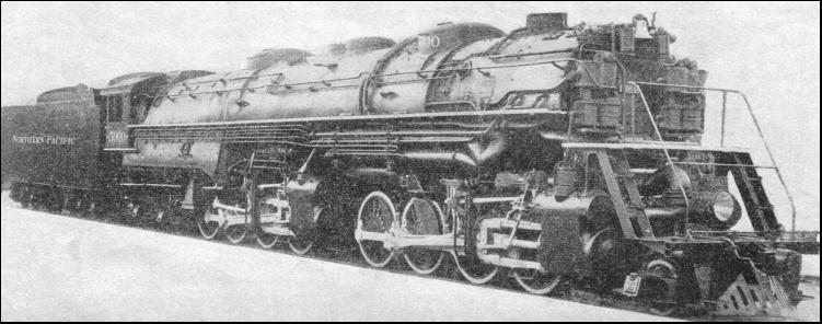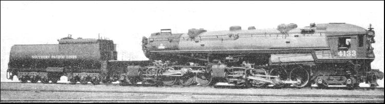 AN OIL-BURNING LOCOMOTIVE used on the Southern Pacific system of the U.S.A. Since the engine operates in mountain territory, the cab-front (right) is enclosed to give protection. The length of the engine is 121 ft. 4-1/2 in. ; weight, 935,500 lb. The four cylinders measure 24 by 32 in., and the driving-wheels are 63-1/2 in. diameter.