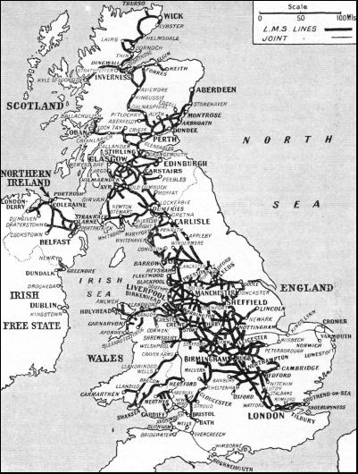 The main line of the former London and North Western Railway runs from Euston to Carlisle, 299 miles distant, by what is known as the West Coast Route. Its main intermediate stations are Rugby, Stafford, Crewe, and Preston. The most important of its numerous branches are those from Rugby to Birmingham (originally a continuation of the main London and Birmingham line); from Crewe to Manchester, to Chester and Holyhead (for steamers to Ireland), and to Shrewsbury (for the joint line referred to later); and from Sutton Weaver Junction, about sixteen miles north of Crewe, to Liverpool. The country of the former North Staffordshire Railway lies to the east of a line drawn from Stafford to Crewe. The North Staffordshire line from Colwich, a junction on the main West Coast Route six miles east of Stafford, provides the shortest route (183½ miles) between London and Manchester, though the fastest Euston-Manchester expresses take the five miles longer route via Crewe. From Carnforth, twenty-seven miles north of Preston, the main line of the former Furness Railway skirts the Lake District and runs to Barrow-in-Furness and Whitehaven. The former Midland main line from St. Pancras to Carlisle, 310½ miles in length, runs via Leicester, Sheffield, Leeds (for Bradford), and Hellifield. A loop-line takes in Nottingham. and another loop avoids Sheffield. From Trent Junction, 20 miles north of Leicester, another main line runs to Derby and Manchester. From Derby an important cross-country line strikes south-west to Birmingham, Bath, and Bristol.