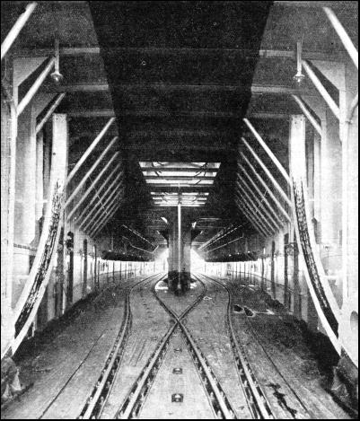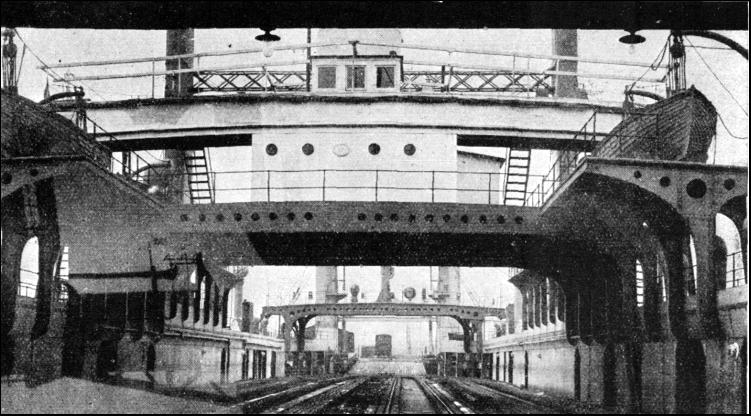The Swedish train-ferry "Drottning Victoria" may be taken as typical of the four, all of which have similar dimensions. She is 370 ft. in length and 54 ft. in the beam ; her draught when loaded is 16-1/2 ft., and her displacement 4,270 tons. To complete the sea journey of fifty-eight miles across the Baltic in four hours, a maximum, service speed of 16-1/2 knots is needed. The main deck, entered from the stern, carries two tracks, each 295 ft. in length, and is capable of accommodating eight passenger coaches, in two rows of four each. The size of coach permissible may reach a total height of 15-1/4 ft., with a width of just over 11 ft., which are the maximum dimensions allowed on the railways of Germany and Sweden. A system of trimming tanks on the vessel enables her to accommodate herself to the level of the rails at the terminals, according to the state of the tide. To secure the coaches during their sea journey, heavy shackles are fitted, both inside and outside the track, the former 4 ft. 4 in. and the latter 8 ft. 8 in. apart. Corresponding shackles are provided on the coach-frames, and by means of specially-designed screws the shackles on the ship and those on the cars are secured tightly together. To prevent the coaches from swaying in heavy weather, similar screws are used to connect the roofs of the cars with the deck girders on both sides. In addition to these precautions, jacks are placed beneath the coaches, and are extended to take the compression off the coach springs.