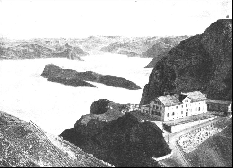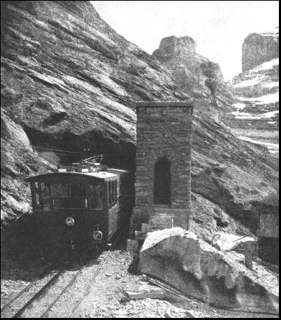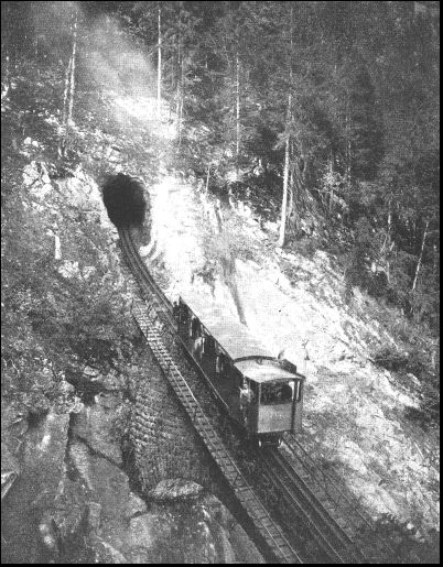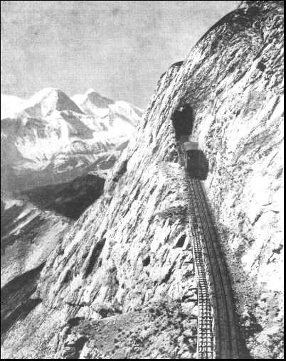 It took six winters for the constructors to fight 3,470 yards. At last daylight glimmered into the workings, and the building of one of the world's highest stations began. The Jungfraujoch station, in the tunnel itself, lies some way from the arrival platform. The building is of an immensely solid structure to withstand the movements of avalanches ; while through its spacious thick glass windows one can see a view of ice, cloud and rock rolling on to the horizon which dazzles and stupefies by the sheer extent of its overwhelming grandeur. Safety DevicesThe railway is electrically operated, the current being supplied from a power station relying upon the Trummelbach for the necessary energy. The track is of the rack and adhesion type, the toothed rail being centred between the two adhesion ones. Every possible safety device has been introduced, and if the electric current, on which the automatic brake depends, should fail, the train, in running backwards, would generate sufficient energy to work the brakes. Guyer-Zeller, the originator of the wonderful undertaking, died before the present line was completed, but he had an even more ambitious project in view. He planned to carry the tourist right to the Jungfrau's snow-covered summit. This final stretch would have been the most arduous of all, for no railway could possibly climb to the summit, so Guyer-Zeller planned that this should be reached by a lift. The conquest of the mighty Jungfrau by rail ranks as one of the most extraordinary feats in European railway engineering, and the ingenuity and skill of the undertaking can only be measured by the astonishment of the tourist at the ease and facility with which he is brought to the region of the clouds. Ascending Mount PilatusAnother notable chapter in the conquest of the clouds by rail was the construction of a line up Mount Pilatus to an altitude of 6,791 ft., having a maximum grade of nearly one in two.