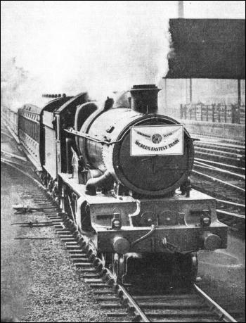 But the best thrills are reserved for the days when the train has left Swindon late, and a driver who is keen on showing off the paces of his steed lengthens his cut-off a notch or two. Then the eighty mark gets left well behind, and the observer notes the speed gradually mounting until by Steventon it has reached eighty-seven, eighty-eight, or, on comparatively rare occasions, even the coveted ninety miles per hour maximum. Very efficient locomotive work is needed to achieve and to maintain such high speeds with little or no assistance from gravity. It is not merely the matter of getting the steam into the cylinder with such lightning rapidity, but the even more important matter of getting it out again. This is where the wisdom of Swindon locomotive designing methods finds such striking proof. Long valve-travels and short cut-offs, which have been standard in Swindon practice for thirty years past, reduce back-pressure in the cylinders almost to vanishing point. This enables the engine to be worked with the regulator fully open, so that there is no throttling of the steam as it enters the steam pipe, and the expansive properties of its pressure may be used to the fullest advantage. No engines in existence in Great Britain run with more freedom at high speed than the Great Western "Castles," and there are probably but few other express locomotive classes in Great Britain that could have maintained so consistent a time-keeping record on this service as the "Castles" have done. The point-to-point timings of the "Cheltenham Flyer" from Steventon onwards demand average speeds in excess of eighty miles an hour. The fastest stretch is from Steventon to Slough, where thirty-eight miles are booked to be covered in twenty-eight and a half minutes, at an average of exactly eighty miles an hour throughout. From Didcot onwards the line flattens out, and the steepest grade subsequently is no more than 1 in 1,320, or four feet to the mile. Speed usually drops slightly between Goring, Pangbourne and Tilehurst, partly because of the resistance of taking water from Goring track-troughs, and partly from frictional resistance as the express negotiates the reverse curves bordering on the River Thames in the neighbourhood of Pangbourne. But only two or three miles an hour are dropped from the ruling speed; by Reading the train is travelling again at round about the eighty-miles-an-hour mark. The value of the movable diamond crossings in the track is fully appreciated as the "Cheltenham Flyer" cuts through the intricate points and crossings at the west end of Reading Station, with not the slightest jolting or discomfort to passengers. Speed continues to rule high while running through Twyford and Maidenhead, and the slight descent, though no more than four feet to the mile, to Slough, may produce another maximum of anything from eighty-three to eighty-six miles an hour or so. On a normal run the highest speeds may be anticipated at Steventon and Slough. Speed may fall slightly below eighty miles an hour onwards through West Drayton and Hayes to Southall, but if the train is behind time, there will now be some slight acceleration, and given, as usually happens, a clear road, the driver will continue at full speed - probably at over eighty miles an hour again - through Ealing and Acton until he is approaching the great gasometers near Westbourne Park, where steam will be shut off. Brakes will be applied to reduce the speed to not more than fifty miles an hour through Westbourne Park Station, and more vigorously afterwards, but it is practicable to run the 1.3 miles from here to the dead stand in the terminus, with perfect safety and smoothness, in just over two minutes, if necessary, thus making possible a very smart stop. So the "Cheltenham Flyer" comes to rest at Paddington, and the chances are that the time of arrival is on the stroke of five o'clock. The fastest recorded journey on the "Cheltenham Flyer," up to 1935, was on June 6. 1932, when a special attempt was made to ascertain the minimum time in which the journey from Swindon to Paddington could be completed. The train consisted of six coaches, weighing 186 tons empty, and 195 tons with passengers and luggage, and was hauled by four-cylinder 4-6-0 No. 5006, "Tregenna Castle." In two miles from the start "Tregenna Castle" was travelling at sixty-four and a-half miles an hour, four miles from starting the rate had increased to seventy-five; and somewhere about five and a quarter miles from Swindon the "eighty" line was first crossed - a remarkable exit. For seventy miles continuously the speed never fell below eighty miles an hour. From Shrivenham it continued gradually to increase until ninety miles an hour was reached at Didcot, and, finally, an absolute maximum of 92.3 miles an hour through Goring Station. For twenty eight miles continuously an average of ninety miles per hour was maintained. In these days, of course, ninety miles per hour is no longer an outstanding speed, but the point of this Great Western run was the maintenance of such tremendously fast travelling on level track, as compared with the falling gradients on which these other momentary feats of speed are usually achieved. Two miles out of Paddington the train was still travelling at eighty-two and a-half miles an hour, steam was then shut off, and the train was brought smartly but smoothly to rest at Paddington fifty-six minutes forty-seven seconds after leaving Swindon, seventy-seven miles twenty-four chains away. Over certain sections of the journey even quicker times have since been achieved, and on a number of occasions the run has been made in an hour, or slightly over, which proves that if the Great Western Railway decided to put a sixty-minute timing over the 77.3 miles from Swindon to Paddington, given a strict limitation of the maximum load of train to, say, seven or eight coaches, it could probably be observed regularly even with existing locomotives. As previously mention