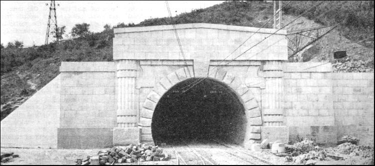 The Pian di Setta Tunnel has a length of 3,334 yards. It runs straight for about 1,820 yards, and then on a curve with a wide radius. Difficult conditions of soil were encountered and heavy emanations of methane gas (marsh gas) had to be overcome. Progress was slow, and thirty yards a day was the maximum. Work was begun in 1921 from the northern side, and in 1925 from the south. Advance headings met in 1928. The "Direttissima" joins the old line, as previously mentioned, at Prato. The impossibility of enlarging the existing station necessitated the transfer of the station 700 yards farther south. A magnificent new station building was erected, and a large modem station was laid out. The following figures give an idea of the magnitude of the construction of the "Direttissima," the total cost of which amounted to £12,200,000 sterling. Embankments represent a volume of 192-1/2 million cubic feet; seventy-five and a half million cubic feet of cuttings were excavated , the excavated material from the tunnels amounted to 101-1/4 million cubic feet, the masonry work in the tunnels to sixty-four million cubic feet. The consumption of electric current required for the plants and installations was 101,340,000 kilowatt hours. The line contains forty bridges, the total length of which is two and three-quarter miles ; thirty-one tunnels with a total length of twenty-two and a half miles, thirty-one and a half miles of embankments, and nearly seven miles of cuttings. But the most outstanding feature of the "Direttissima" is the Great Apennine Tunnel, the length of which is 20242.21 yards—eleven and a half miles. Although it is 1,546 yards shorter than the Simplon Tunnel, the longest in the world, the Apennine Tunnel may be considered as the greatest example of tunnel construction in existence, for it is built for a double track, whereas the Simplon has single-track tunnels.