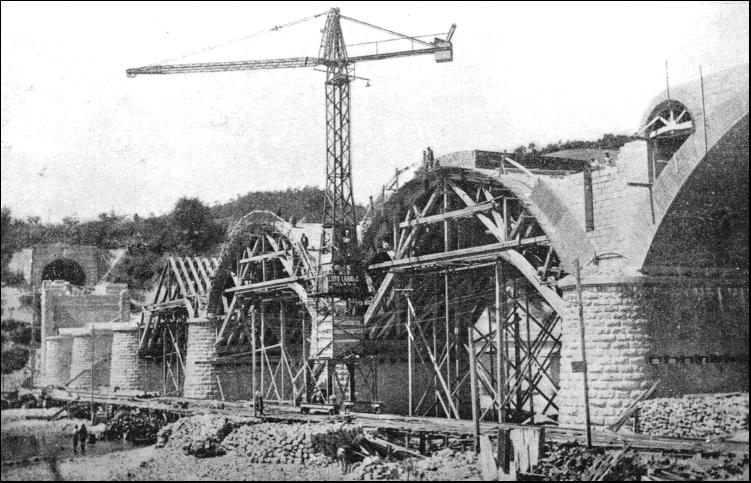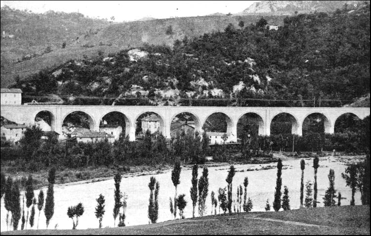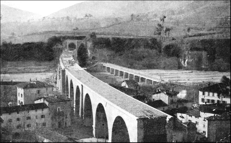The "Direttissima" branches off the Bologna-Ancona line immediately on leaving Bologna. It turns southwards, crosses the river Savena by a masonry bridge of seven arches of 46 ft. span, and continues on the right bank as far as Pianoro. Shortly after this station the line crosses the Savena by a bridge of six arches (five spans of 50 ft. each and one of 20 ft.) and enters the Monte Adone Tunnel, which has a length of 7,694 yards. Having left this tunnel, the line enters the Setta Valley near the station of Vado and, having passed through another tunnel, negotiates the valley by means of an imposing viaduct-bridge of fourteen arches, of which seven are of 65 ft. 7 in. span and seven of 82 ft. span. The line continues on the left bank of the Setta as far as the station of Grizzana. A large number of tunnels and viaducts was necessary on this track. There is a viaduct over the Scopa with twelve arches of 50 ft. span ; another over the Casone with fourteen arches of 40 ft. span, and a third across the Quercia with eleven arches. All these viaducts, as well as the others on the line, are masonry constructions, for which Italians have always been famous. Beyond the station of Grizzana the line crosses the Farnetola Valley by a viaduct of twelve arches, of which eleven are 66 ft. and one of 40 ft. span. Here the Pian di Setta Tunnel begins, which has a length of 3,334 yards. On emerging from the tunnel the Brasinone river is crossed by a viaduct of three arches of 83 ft. span and two of 66 ft., and after a short tunnel the Setta is crossed by a skew bridge with three arches of 66 ft. and three of 40 ft. The line continues on the right bank of the Setta, crosses the river again over an oblique bridge of five arches of 40 ft. span, and enters the Great Apennine Tunnel. From this it emerges near the junction of the rivers Fiumenta and Bisenzio, crossing the latter, and continuing on its left bank as far as the station of Vernio. After having crossed the Bisenzio twice the new line reaches the station of Vaiano and finally joins the old one at Prato.