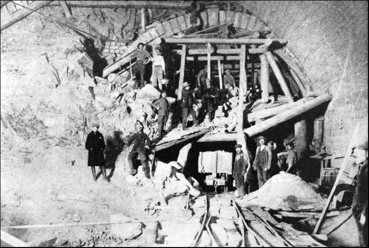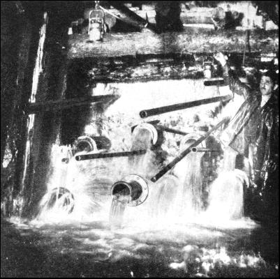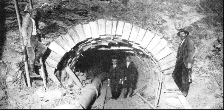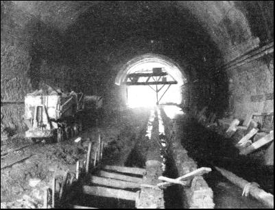 Outbreaks of fire were more serious. One, at about three miles from the north portal, stopped work in the affected zone for seven months. This outbreak occurred during blasting, when an onrush of gas occurred and the timbering took fire. Despite all efforts the fire could not be extinguished. On the next day another heavy explosion occurred at the same spot. The ventilation bulkhead was destroyed for over 1,100 ft., as well as the cabin of the ventilation engineer. The upper and lower headings, which intercommunicated, were filled with heavy smoke, for, owing to the collapse of the bulkhead, the whole ventilation system had been damaged. An heroic crew drove up on a compressed air locomotive to the burning timbering. The men flooded the area and checked the fire. Only then was it possible to ascertain that the lower heading had collapsed through the burning of the timbering. The temperature had reached 212 degrees. The temporary bulkhead was rebuilt, and also the ventilating cabin. Meanwhile, in the part of the upper heading where the fire continued unabated, three powerful hydrants protected the scaffolding which was erected to replace the wooden timbering with steel shores. Three fine-mesh wire nettings were put up at a distance of 3-1/2 ft. from one another. But the fire continued furiously for two and a half months. Matters became worse through emanations of gas in the lower heading, they issued from a gas-filled cavern below the tunnel. The whole lower heading became filled with gas and hindered all efforts to extinguish the fire. It was decided to flood the heading to a depth of 14 ft. at the back of a wall which was put up across the heading. In order not to protract the stoppage of work in the northern part of the tunnel, a by-pass tunnel was constructed at 50 ft. distance from the tunnel, over a length of about 700 ft. This by-pass was bored at a short distance in front of the cross wall, and it joined the track of the tunnel beyond the flooded section so that work could proceed. Over 330 ft. were completed beyond the flooded area during this time. Five months after the outbreak the flames had disappeared, and it took another two months to repair the damage.