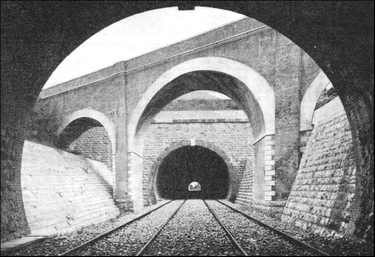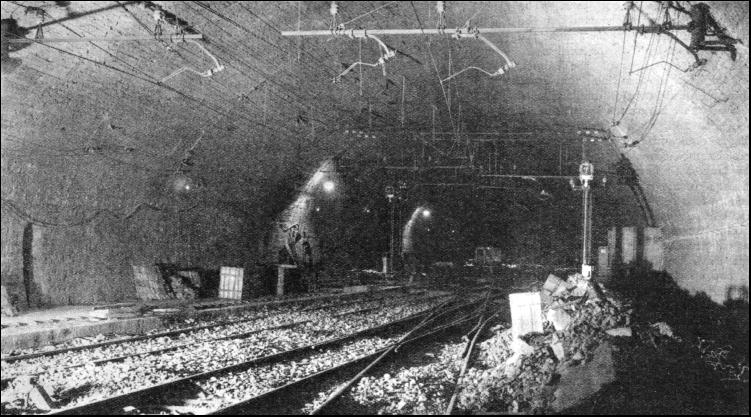 The method of driving the tunnel was as follows : First a bottom heading, 13 ft. 1-1/2 in. by 10 ft. 6 in., was driven over a given distance and the narrow gauge railway laid in it. Next, a top heading, 8 ft. 2-3/8 in. by 6 ft. 6-3/4 in., was driven corresponding to the line of the crown. Between these two headings a horizontal division, about 7 ft. thick, remained, which represented the floor of the upper heading. Vertical shafts bored through this division provided communication between upper and lower headings for the purpose of removing excavated material from the upper heading. The spoil was shot through these shafts directly into the trucks in the bottom heading. The top heading was afterwards widened and extended as far down as the springing of the arch. The centring was then set in to keep the arch in position, and the arch excavated to its full dimensions. When the arch was in position the horizontal division between the two headings was removed and the bottom heading excavated to its full dimensions. During this work the arch was supported by timbering. On completion of the side walls the inverted arch was set in. Although the geological survey had made it clear that the soil was of the most difficult kind for tunnel construction, the difficulties which were encountered on certain sections were never expected. The swelling clay soil had given trouble on the northern side, but heavy timbering, sometimes steel centring, the reduction in length of the working sections and the method of completing the lining overcame the difficulties. At a point about one and a half miles from the north portal, however, a serious situation arose. The pressure of the swelling clay was greater than any timbering could withstand. The strongest pieces of 25 in. diameter were shattered to splinters, the strongest steel shoring was bent and gave way. Stronger timbering, steel constructions—combinations of both—were tried. Repeatedly they crumbled beneath the seemingly infinite power. But man conquered again. A new method of tunnel driving, which will no doubt be adopted in future in similar circumstances, was created. The so-called "Italian" method consisted of driving the bottom of a circular section with a diameter of 14 ft. and lining the circumference with rings composed of staunch wooden wedges like keys. The resistance of this cylinder-like structure was powerful enough even in this instance. When deformations occurred in the lining they were easily repaired by driving wedges into the cracks of the lining. Advance headings met in the northern part in November 1929 and in the southern part in December 1929. A feature of the tunnel is the large passing station constructed about mid-way between the bottom of the inclined shafts. Its purpose is to permit fast trains to overtake slow traffic. The station consists of a vast hall which is 505 ft. long and 29-1/2 ft. high ; the diameter of the arch is 56 ft. At either end of this station sidings were built in independent tunnels which join again with the main tunnel. The length of these sidings is 1,470 ft. The section of the tunnel varies according to the nature of the ground. The radius of the crown extends from 14 ft. 6 in. to 14 ft. 9 in., and the height between crown and the inverted arch from 24 ft. 3 in. to 26 ft. Also the thickness of the lining varies. At the crown it is from 1 ft. 9-1/2 in. to 3 ft. 3-1/2 in. and at the inverted arches from 1 ft. 3-3/4 in. to 2 ft. 7-3/4 in. In the passing station the lining of the crown is 4 ft. The magnitude of the tunnel construction may be judged from the following figures : The excavated material amounted to 69 million cubic feet, the masonry work (linings) to 16 million cubic feet. The consumption of electric current was 110 million kilowatt hours, 981 tons of dynamite were used for blasting, an average of 8-1/2 million cubic feet of compressed air was used for traction purposes and for driving the drills and pneumatic hammers ; the average number of men working inside the tunnel was 1,300, and the average number working outside in the yards was 550. The cost of the tunnel was £5,100,000, or £252 per yard.