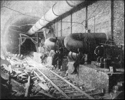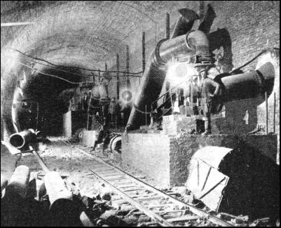 In view of the great length of the tunnel careful provisions were made to ensure the supply of fresh air to the farthest working points. The ventilation plants were installed at the two portals and at the two shafts. As the headings proceeded, an auxiliary ventilating plant was installed within the tunnel. Fresh air was supplied at 850 cub. ft. per second. The average daily rate of fresh air driven into the tunnel by the powerful ventilators was fifty-eight million cubic feet from the north entrance, fifty million from the shafts and thirty-five million from the south. On account of such large volumes of air it was necessary to divide the completed and lined sections of the tunnel by a temporary brick bulkhead running longitudinally. Two ducts were formed, the fresh air being driven through one side, the used air escaping through the other. The ventilating plant at either of the portals consisted of two Sulzer fans, each of 850 cub. ft. capacity and driven by 145-170 h.p. motors ; at each of the shafts two Cerpelli fans of 650 cub. ft. each were installed. The auxiliary plant at either heading consisted of a set of fans of 210 cub. ft. driven by 45-55 h.p. motors. These auxiliary fans drew the air from the main ducts and drove it through metal pipes of decreasing diameters to the working faces.