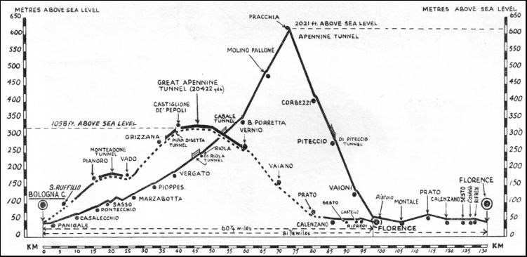 One of the results of the survey was to show that the original estimate of £6,000,000 would not be sufficient. A second provisional estimate for £7,000,000 was made. The provisional project was approved in 1911, and the elaboration of the definite project in all its details was taken in hand. Work on the line began in 1913. This was on the section between Bologna and Pianoro. The new route extended from Bologna to Prato, a station on the old line eight and three-quarter miles from Florence, where the new line joins the Porretta line. The distance between Bologna and Prato is just under fifty-two miles, and the line is laid with a double track. The highest point is at an altitude of 1,058 ft. The maximum gradients in the open are 1 in 85, and in tunnels 1 in 125, with the exception of the Great Tunnel, where gradients are 1 in 500 and 1 in 175. The curves have a radius of 880 yards on the Bologna and of 660 yards on the Florence side. The distance from Bologna to Florence is sixty and a quarter miles, whereas via the Porretta line it is over eighty-one miles. The difference is about twenty-one miles, but the value of the new route, from the working point of view. is enhanced out of all proportion to this reduction of distance, by reason of the considerable lessening of the gradients. The journey from Bologna to Florence now takes sixty-six minutes, while freight trains of 950 tons weight can be hauled over the new line with the same tractive effort as was required for 480 tons over the old line.