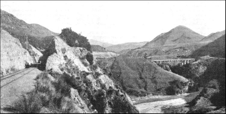 A dramatic introduction to the South Island is obtained on this voyage. The rocky gates through which the steamer passes into Lyttelton Harbour are really the opening of an ancient volcanic crater, and the bills that encircle the harbour, with their ramparts of rock at various points dropping sheer down to the water, are largely composed of lava. It is through a precipitous rhyolite lava range that the train makes its Way by tunnel out of Lyttelton. The tunnel, 2,860 yards in length, was the longest in the Dominion until the opening of Otira Tunnel. Yet Lyttelton Tunnel formed a part of the first railway to be laid in New Zealand. Lyttelton Tunnel, indeed, was a tremendous problem. The settlement was less than twenty years old when the railway was decided on in the 'sixties, and the tunnel alone cost £195,000. Each province in those days had its own parliament and its own system of finances ; and it fell to the Canterbury Provincial Government to find the money for the scheme. The engineer and chief surveyor of the province was entrusted with the engineering of the line—tunnel included—and carried it through to a successful conclusion in the year 1867. This first railway in New Zealand had a gauge of 5 ft. 3 in., decided on by the Canterbury Provincial Government for its lines, to agree with the gauges of South Australia and Victoria. But when the Federal Government of New Zealand took over the railways in both islands, standardization was essential, and 3 ft. 6 in. was the standard settled on. The present gauge in the South Island, therefore, is but two-thirds the width of that which was first laid. The old broad gauge stock was sold, after the change of gauge, to the South Australian Railways, but on the way from New Zealand much of it was lost at sea in the wreck of the: ship 'Hyderabad' on Otaki beach.