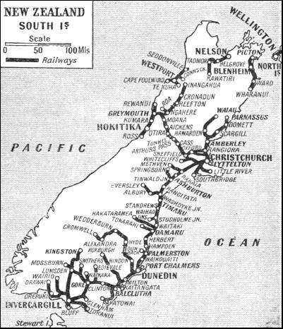 No less interesting than the railways of the North Island of New Zealand are those in the South Island. The mountain backbone of the South Island reaches considerably higher altitudes than any of the mountain ranges in the North Island. As compared with the latter's highest peak—Ruapehu, with an altitude of 9,175 ft.—Mount Cook in the South Island towers to 12,349 ft. above the sea. The west coast, with its deep inlets and ice-mantled peaks, gives a combination of Norwegian and Alpine scenery that probably has no rival in the world, especially as many of the mountains in the Southern Alps of New Zealand can be seen in all the majesty of their full height from the level of the sea itself. For many years of railway history in the South Island this mountain chain proved an insuperable obstacle to railway communication. The main railway system, connecting the cities of Christchurch, Dunedin, and Invercargill, along the plains that fringe the sea down the east coast of the island, was completely cut off from the smaller west coast system, serving Westport, Greymouth, and Hokitika. But the mountain chain was finally pierced, and the two systems were linked up. In the Otira Tunnel, five and a quarter miles in length. New Zealand is proud to possess the longest railway tunnel in the British Empire, beating the Connaught Tunnel of the Canadian Pacific Railway, in the Rockies, by a little over a quarter of a mile. The tunnel was completed and opened in 1923, and will be referred to in more detail later on this page A casual reference to the map might lead the observer to the conclusion that the obvious connexion between the North and South Islands of New Zealand is across the narrow width of the Cook Strait, from Wellington across to Picton. A steamer service is certainly maintained across this often rough stretch of water, and a railway is found on the south side of the strait. But it travels only as far as Wharanui, down the east coast. Then comes a stretch of very difficult country, from the engineering point of view, where the Kaikoura ranges strike out to the coast. This region also is so sparsely populated as to offer little inducement for railway building. At present, therefore, there is a gap of eighty-two miles along the east coast until Parnassus, the most northerly point on the main railways system of the South Island, is reached. So the traveller from Wellington to Christchurch embarks on one of the fine steamers maintained by the railway administration, of which the biggest is of 6,000 tons register. He sleeps comfortably on board, and is taken from one capital to the other—or, strictly, to Lyttelton, the port of Christchurch—in eleven hours, the distance covered being 174 miles. The journey is thus completed overnight ; nine hundred passengers can be berthed on one of the vessels.