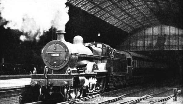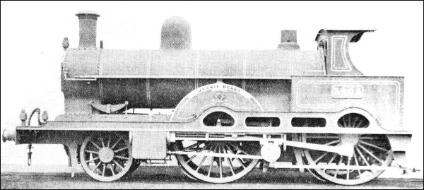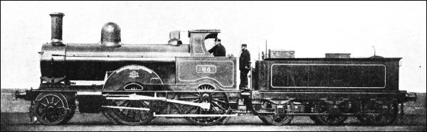The first of these, officially described as a "Patent Engine for Suburban Work," was employed on the "Outer Circle" route between Broad Street and Mansion House - one of London's numerous vanished train services. On starting it communicated to the train a "peculiar fore-and-aft surging movement" to such an extent as to "earn for itself more unpopularity with the travelling public than probably any other locomotive ever built." The last of the three was originally intended to be a goods tank; but, instead of coupling the three rear axles, Webb adopted the device of coupling on to the trailing and central driving wheels, which were actuated by the high-pressure cylinders, while the leading pair was driven by the low-pressure cylinder. The wheel arrangement was thus unique. The "double single" arrangement was also employed on the later eight-wheeled express engines of the "Greater Britain" and "John Hick" classes. A special feature of these engines was the unusually long boiler, which was divided into two lengths by a combustion chamber. Ten were built of either class; the "Greater Britains," with 7 ft. 1 in. driving wheels, and the "John Hicks" with 6 ft. 3 in. driving wheels. These two classes were the only British tender engines to have the 2-2-2-2 wheel arrangement. "Greater Britain, " appeared in 1891, the "John Hicks" between 1894 and 1898. In either class the high-pressure cylinders were 15 in. by 24 in., and the low-pressure cylinder 30 in. by 24 in.
