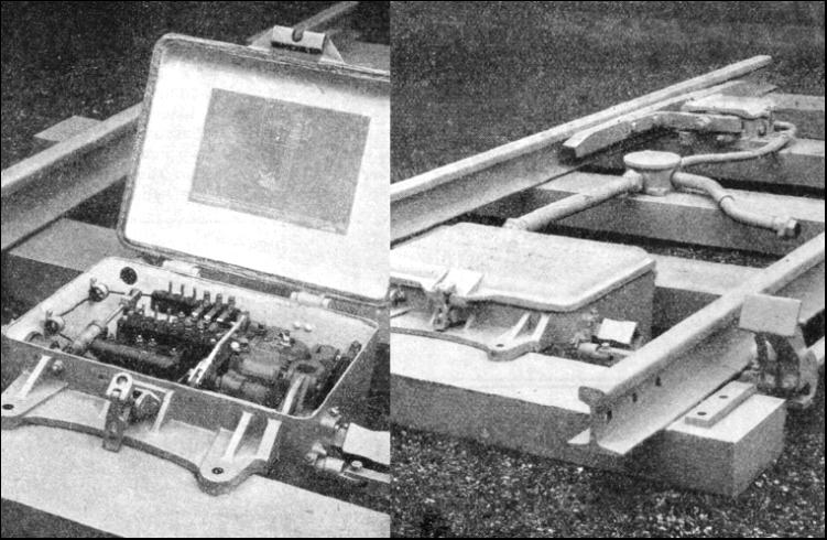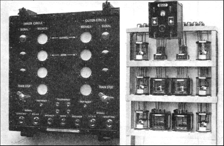 The problem has been solved by utilising the conductor rails from which current for lighting is supplied to the trains. These conductors, which are fed by alternating current, and are carried on the walls of the tunnels. have been divided into signalling sections of suitable length, the lighting current thus operating the signals. In normal conditions, only one train occupies a section at a time; when this is occupied the lighting current actuates the signal, and, since the current does not flow when the section is unoccupied, the "line clear" indication is given. To guard against the remote contingency of a train entering a section with extinguished lights, a "track instrument" is installed at the entrance to each signalling section, and the passing of a train over this appliance automatically puts the signal protecting that section at danger until the section is cleared. The equipment includes also the automatic train stop and the trip cock as used on the London Underground railways. In addition, there are tunnel wires throughout the system. These not only enable the traction current to be cut off in an emergency, but can be used also for telephoning to the nearest station in the event of breakdown in the tunnels, the drivers being provided with telephones.