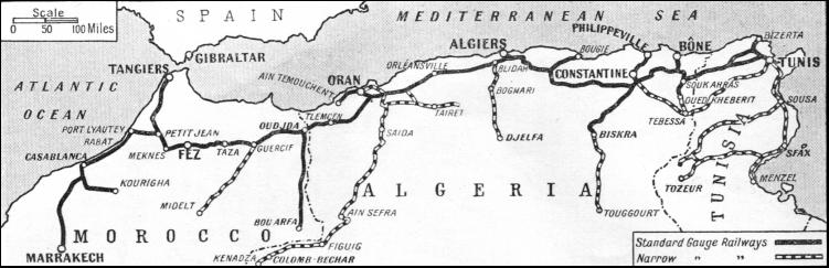 Should this Trans-Saharan Railway be pushed forward, it would make a connection with the southern terminus of a long narrow-gauge branch of the Algerian State Railways which extends from the Mediterranean port of Oran, through the Atlas Mountains to Colomb-Bechar, and on over the desert to Kenadza. Constructed almost entirely for military reasons, this line passes through the region where training is given to the Foreign Legion, the Zouaves, and the Chasseurs d'Afrique. It is at Colomb-Bechar that the present postal service for Timbuctoo and the French Sudan is handed over from the railway to automobiles, and specially-built postal vehicles are convoyed every fifteen days over the 1,000 miles of desert to the banks of the Niger. Two other narrow-gauge military railways run far south into the desert, but the main Algerian lines run east and west, connecting the big towns of Oran, Algiers. Constantine, and Phillipeville. Originally there were three big railway systems, the Algerian State, the Algerian Western, and the P.L.M. (Algerian). The last named was the property of the famous Paris, Lyons and Mediterranean Railway, whose trains connect with the boats sailing to Algiers from the Joliette Quay at Marseilles. Shortly after the war of 1914-18 the P.L.M. (Algerian) was given the right of working the Algerian Western. Recently the Algerian State and P.L.M. Railways have come to such a close working arrangement that they are virtually under one management, the unified system now being known simply as the Algerian Railways.