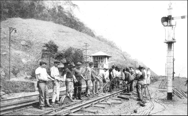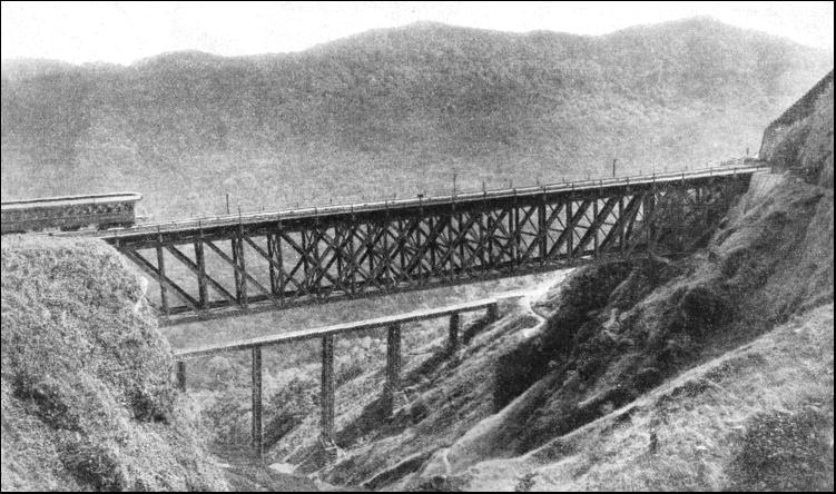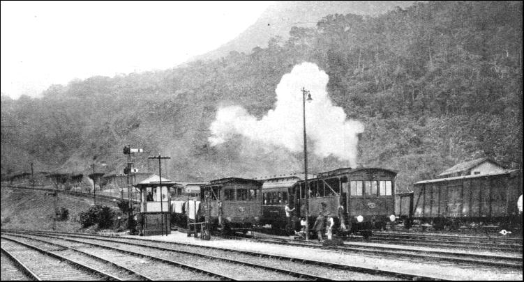 Young Fox spent fifteen months preparing these plans, and then he set sail for England with his proposals. They were scrutinised minutely by the master-mind of Brunlees. As the cost of building a railway on the young mans plans would not exceed the limit of £2,000,000 Brunlees gave the ingenious solution of the problem his wholehearted support. The project received the approval of the company which had been formed to build the line, and construction was begun. Fox, when he presented his surveys, did not fail to point out the fact that heavy excavation and development work would be unavoidable in scaling the Serra, and his cautious statements proved to be in no way exaggerated. When the railway builders appeared upon the scene they found themselves faced by conditions which had seldom been previously equalled in such operations. Although the first dozen or so miles out of Santos run through practically level country for a greater part of the way, the land is marshy, and before it reaches the foot of the cliff the line has to cross an arm of the sea and two formidable rivers, both of which are subject to heavy and sudden fluctuations in level. For time first eight miles a low embankment had to be raised to receive the metals laid on the 5 ft. 3 in. gauge, the course of the line paralleling the Government road laid across the marshes. A 500-ft. bridge takes the railway across the arm of the sea which separates from the mainland the island on which stands time port of Santos. The Cubatão River is crossed by four 75-ft. spans, and the Rio Mugy by three 66-ft. spans. But it was the incline section which puzzled the builders. In the first place, in order to haul their supplies and material to their scattered camps, they had to drive roads through extremely rough country and dense forest. As the region was uninhabited and for the most part unexplored, reliance had to be placed upon the rough maps which Fox had drawn when preparing his surveys. The railway in its climb to the plateau ascends the spur forming the east bank of the Rio Mugy. The sides of the mountains are torn by gullies, chasms, couloirs, and rifts in the most fantastic manner. As these run at right angles to the railway their negotiation presented many problems, as did also the overcoming of the spurs and shoulders of treacherous rock forming the walls of the gaps. Owing to the composition of the mountain, which consists of granite and rubble, blasting in the face of the precipice was impossible and the outside rock had to be cut away by hand. Some of the cuttings are of great magnitude, running to depths of nearly one hundred feet. The trials of the builders were aggravated by the many land slips and rock-slides, precipitated by the heavy rainfall. Time after time an embankment completed ready for the rails was demolished. As a rule, the earth could be prevented from slipping only by throwing up at vital points massive retaining walls varying from ten to sixty feet in height.