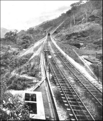 The inclines are laid out upon an ingenious principle. As they are worked upon the counter-balancing system, whereby one load descends while another ascends, a crossing has to be provided at a halfway point. On the lower part of each lift an ordinary single track is laid, branching out at the passing point into two tracks, which are of sufficient length to accommodate the longest trains. But above the crossing there are three metals, the centre rail being common to both up and down traffic. This arrangement permits of two lines of cable pulleys - one on each side of the centre rail - one for each load, while below the crossing only a single line of pulleys is necessary. At each bankhead a pair of non-condensing horizontal engines of 150 nominal horse-power were installed to drive the winding machinery. The rope pulleys, 10-ft. in diameter, were driven through friction gearing. A special brake wagon operating a clip brake was attached to every train running in either direction. Each train averaged about four vehicles. The time occupied in negotiating each incline was about fifteen minutes, or one hour for the ascent of 2.550 ft. from the foot to the summit of the Serra. Four trips per hour could thus be made, although, if necessary, the journey could be accelerated by about fifteen minutes. Fox succeeded in keeping within the estimates. The contractors built the railway ten months ahead of the specified time (eight years) and were awarded a bonus of £43,750 by the Brazilian Government. The line was opened to traffic in the year 1867. This section of the inclines is, of course, the old one, and it is still used. But the coffee traffic gradually outgrew its capacity, and a new track was laid, roughly parallel to the first, and constructed upon the same cable system. The new line, which was opened in 1901, is laid somewhat higher up the mountain side, the shoulders and spurs being tunnelled, while the rifts are spanned by heavy steel bridges. The new cable-way up the Serra, which is in five sections instead of four, has considerably shortened the duration of the climb. When the locomotive is uncoupled at Piassaguera the train is divided into sections of three coaches, each section going up at intervals of nine minutes. The system of rope haulage on the old line is known as the "Tail-End" system, while that on the new is called the "Endless Rope" system. These cables are wonderful pieces of workmanship. They are made in England, and are an expensive item in the upkeep of the railway. Each costs £2.000 when new, and lasts from about eighteen months to two years, according to the varying amounts of work it has to do. The rope is composed of six strands of steel wire on a hemp core, and has a circumference of five and a quarter inches. The breaking strain, of 108 tons when the rope is new and 72 tons when it has been worn, gives a wide margin of safety, as the maximum working load on the rope from all sources is eighteen tons. Every day the rope is examined by experts with the care that befits such an expensive patient. The safety precautions prevent anything terrible from happening if a cable should break; but the cable does not break.