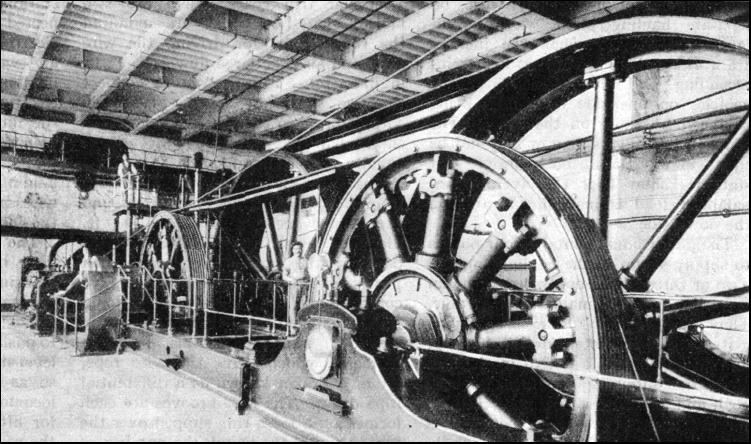 The wire rope enters the engine-house from the up line, makes four turns round the rope wheels, passes to a 14 ft. diameter fixed return wheel at the back of the power-house, and then passes out to the down line. Five complete and similar systems, it should he remembered, work the five separate inclines. The rope wheels, 14 ft. in diameter, which drive the wire rope, are of a design known as a differential rope drum. The rope grooves are each formed on a loose ring slipped over the turned rim of the wheel, the number of rings being in accordance with the number of turns or wraps which the rope is given on the wheels to obtain the necessary friction for the drive. This design avoids the extraordinary strains in the wire rope which would be caused by inequality in the diameter of the rope grooves due to unequal wear.